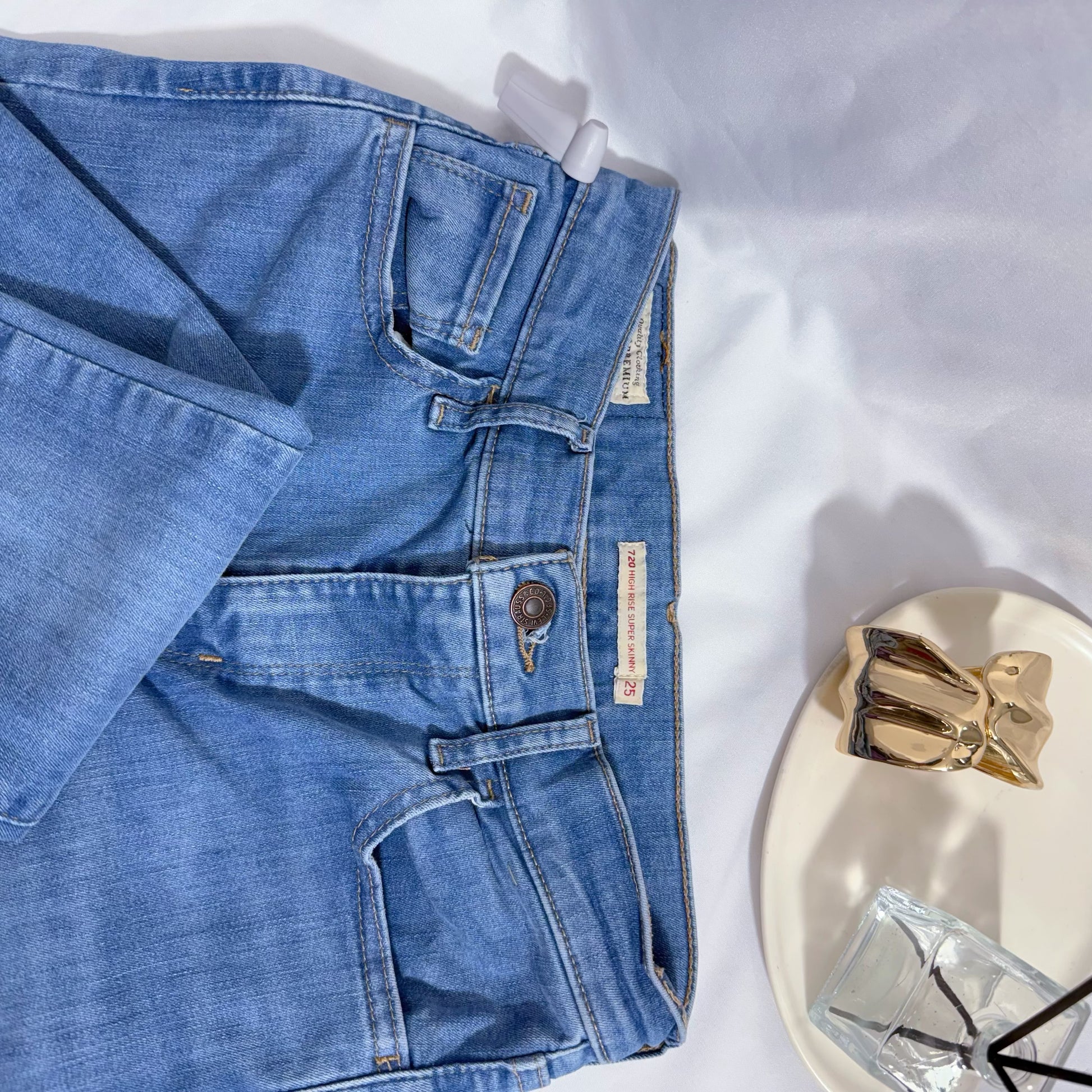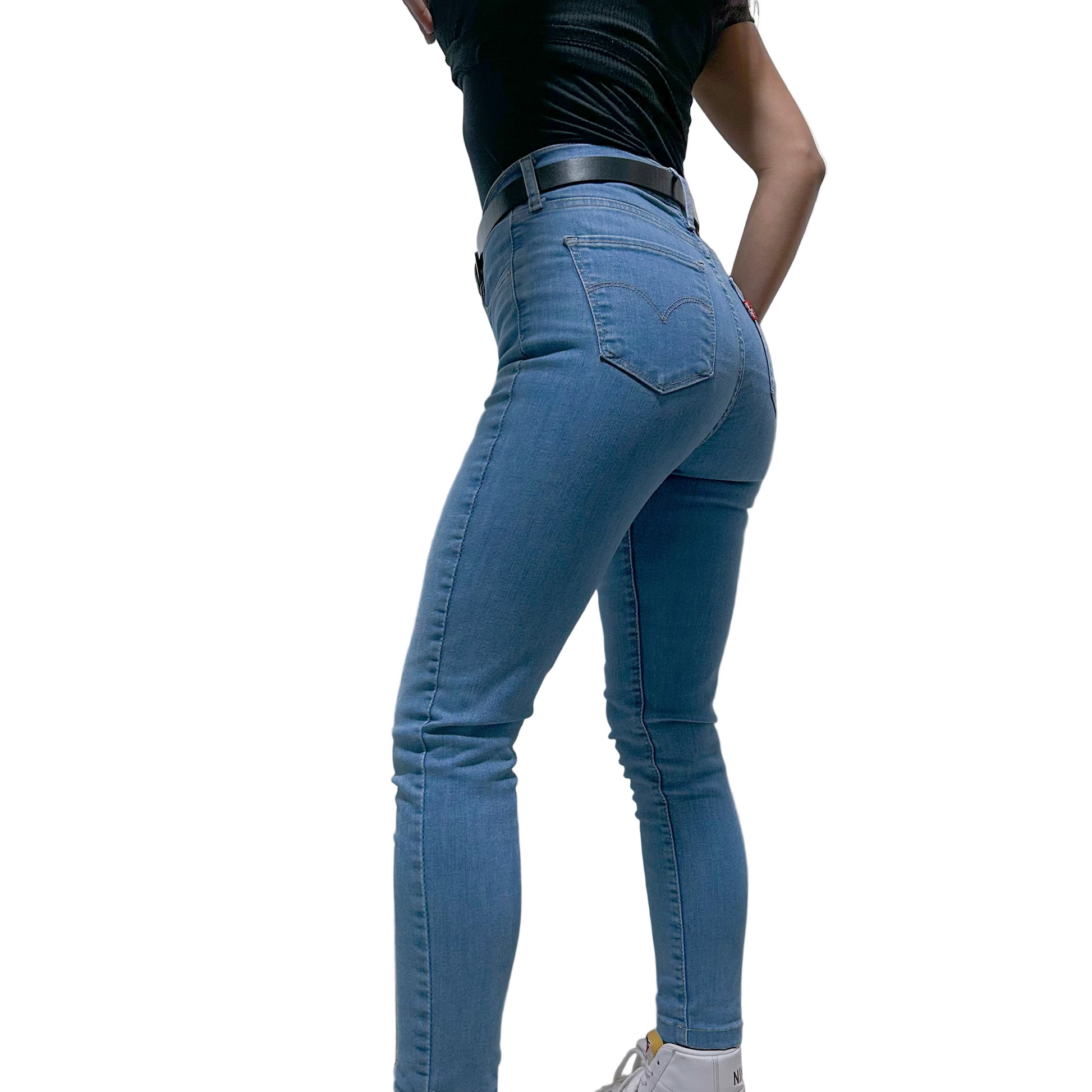 Jean Levi’s original, corte skinny fit en tono azul claro clásico, confeccionado en denim elástico de alta calidad que se ajusta perfectamente a la silueta sin perder comodidad. Su diseño incluye tiro medio, cierre y botón metálico frontal, y los característicos bolsillos de cinco piezas con costuras firmes y precisas, sello distintivo de la marca.