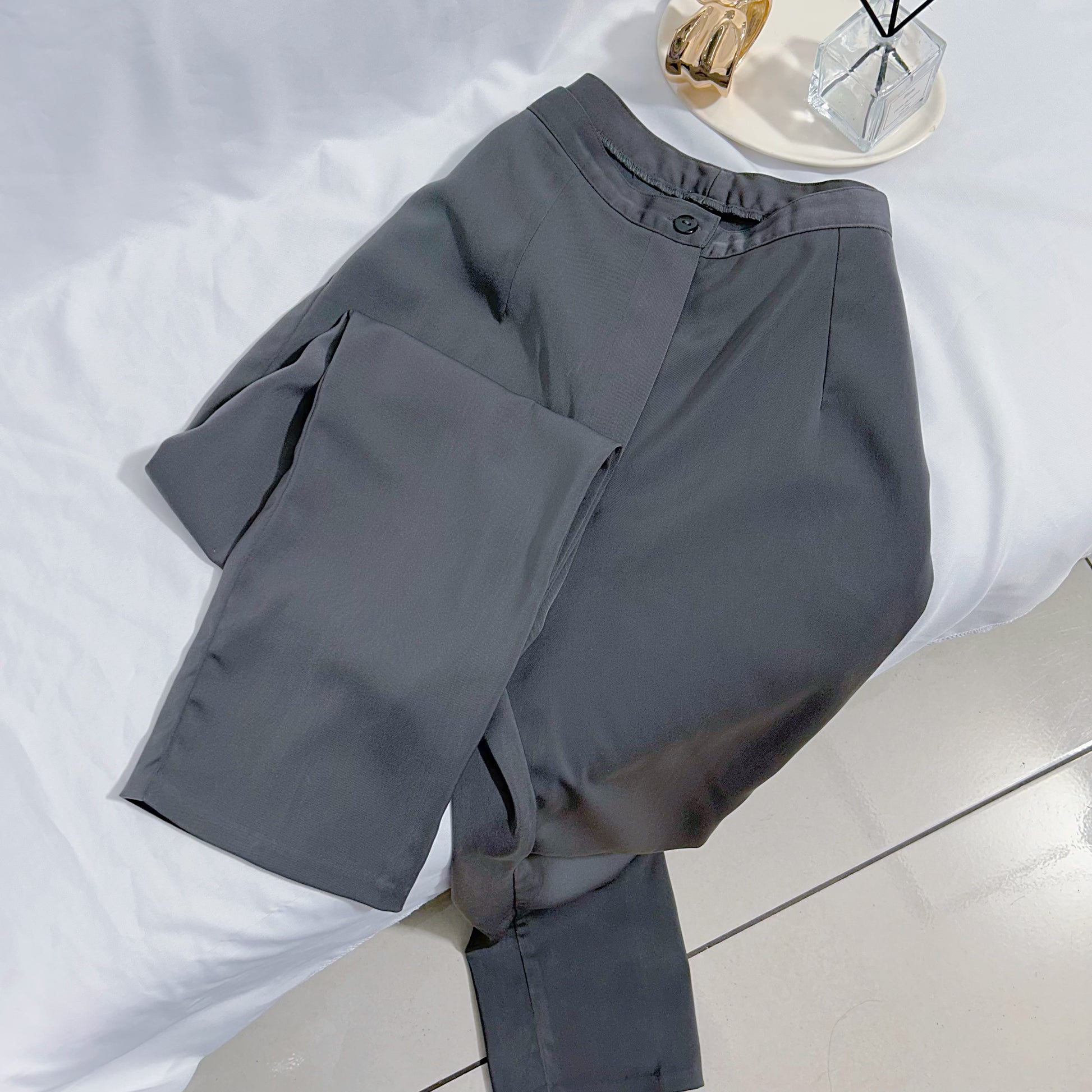 Pantalón confeccionado en tela satinada de acabado suave y elegante, en tono gris oscuro que aporta un aire sofisticado y versátil. Cuenta con corte recto y caída fluida, tiro medio con pretina simple y cierre de botón con cremallera frontal, ideal para lograr un look pulido tanto en ocasiones formales como en outfits nocturnos con un toque moderno.
