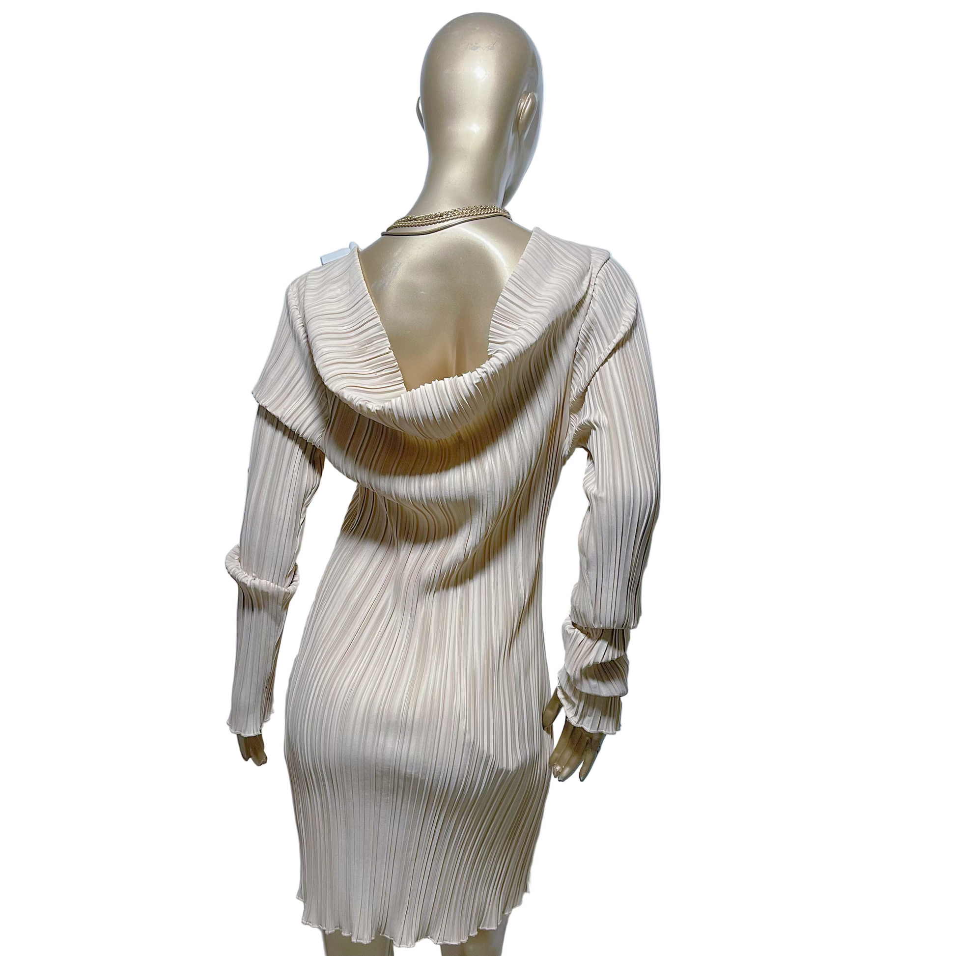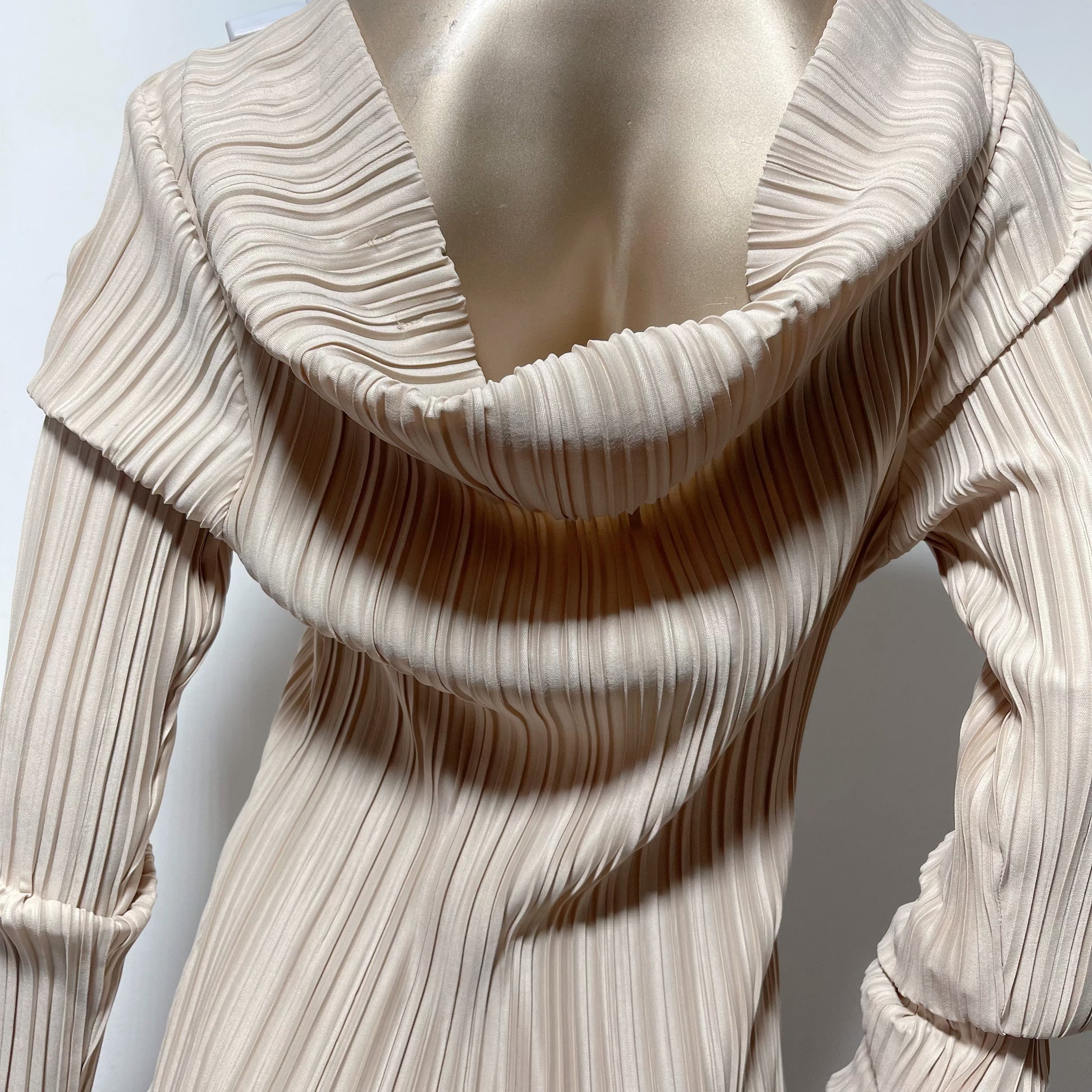 Vestido corto plisado en tono beige, marca Boohoo, diseñado con textura acanalada vertical que estiliza la silueta y aporta un efecto elegante. Presenta mangas largas con caída natural, escote redondo clásico al frente y un escote profundo tipo drapeado en la espalda, que añade un detalle sensual y distintivo.