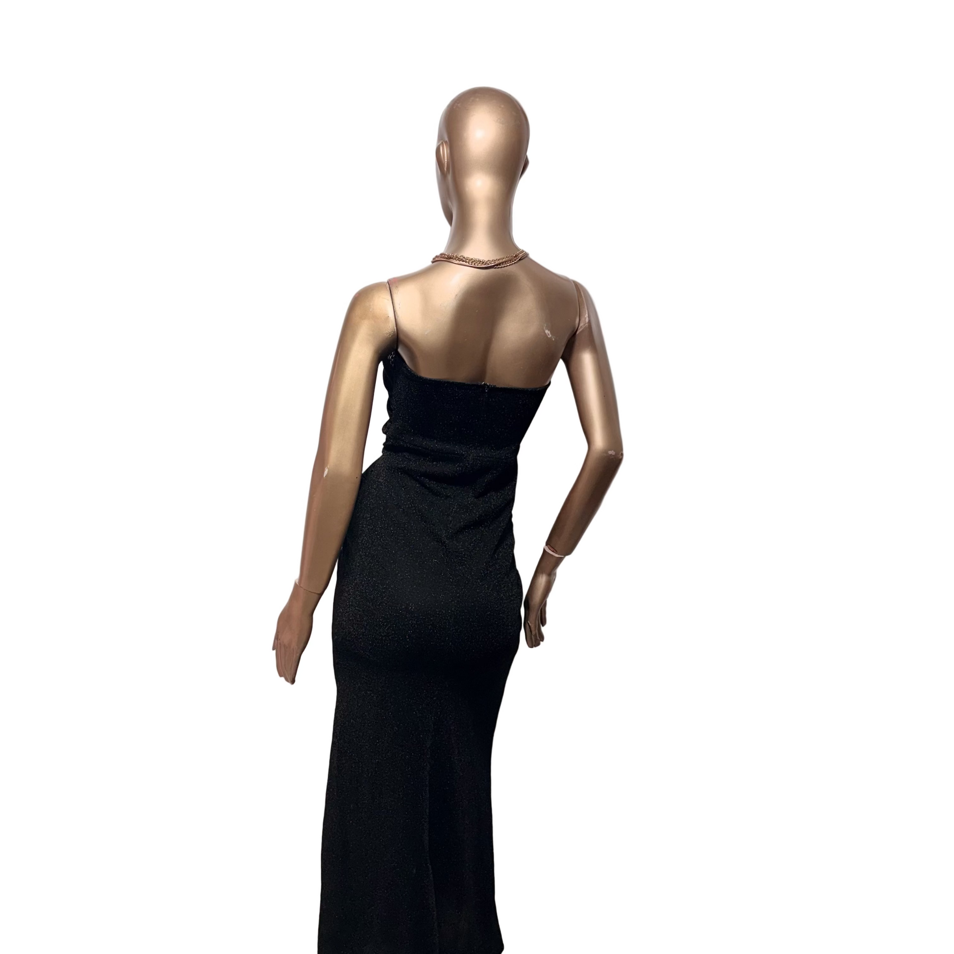 Vestido elegante de la marca Daisy, en color negro con acabado brillante, ideal para eventos de noche o celebraciones especiales. Diseñado con un escote palabra de honor que realza el cuello y los hombros, y un ajuste ceñido al cuerpo que moldea la figura con sofisticación.