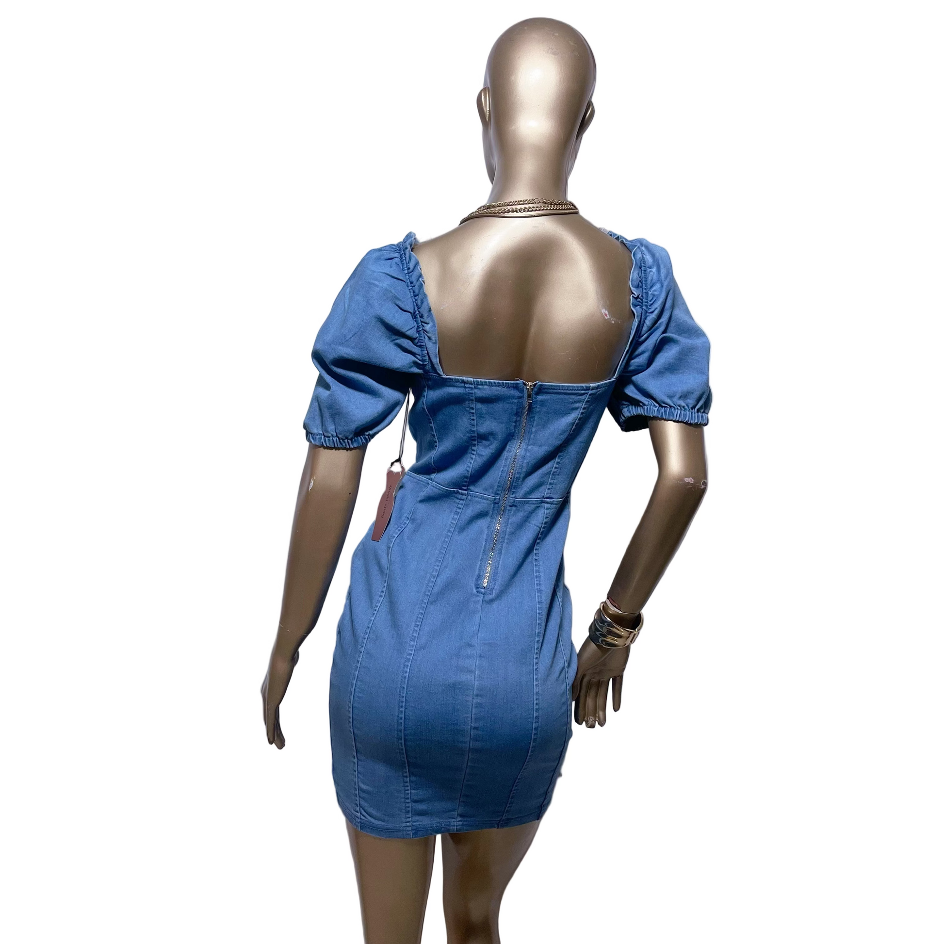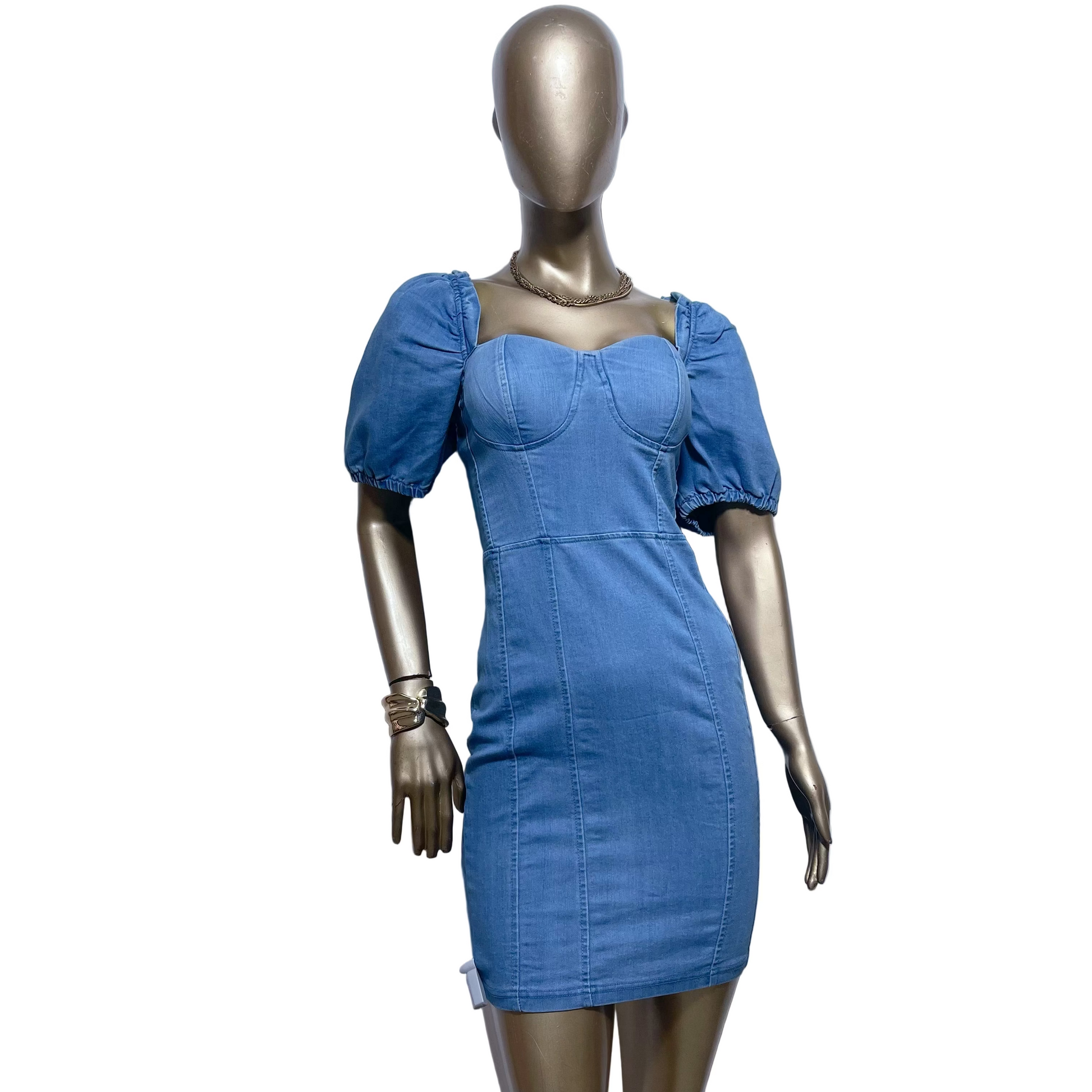 Vestido corto de mezclilla marca Haute Monde, con diseño ajustado y femenino. Cuenta con escote estilo corset con copas marcadas, que realza la silueta, y mangas abullonadas con puño elástico, aportando un aire romántico y moderno. Su confección en denim ligero le da un toque juvenil y versátil, ideal para diferentes ocasiones.