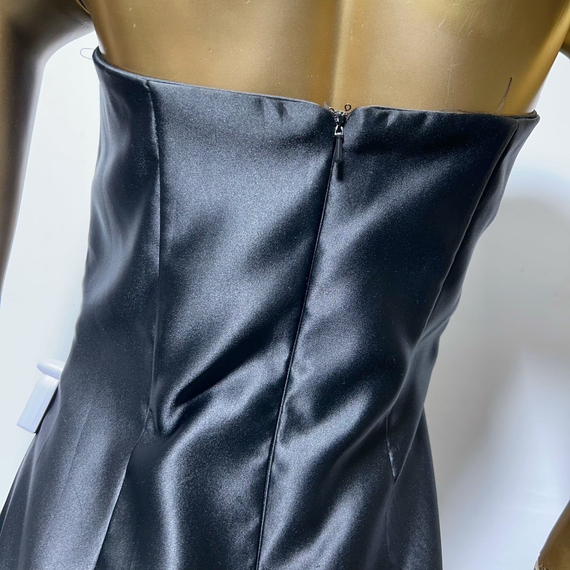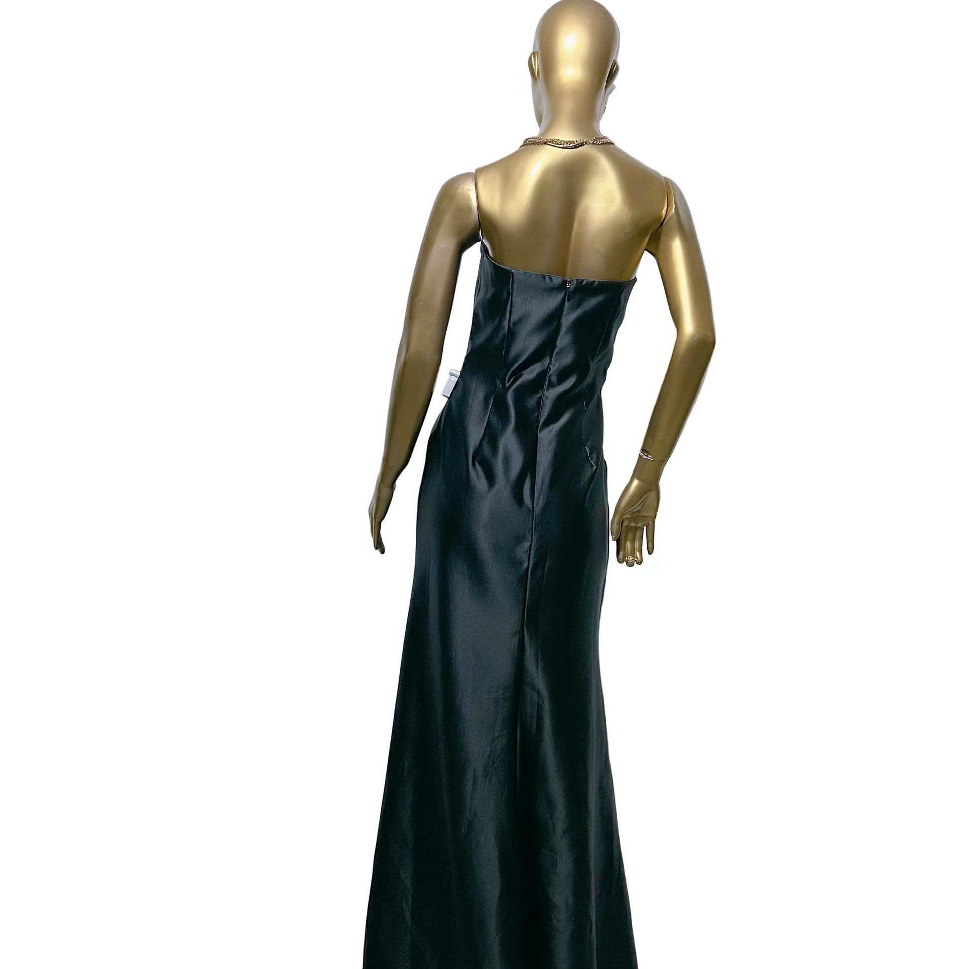 Vestido maxi de la prestigiosa marca Scott McClintock, confeccionado en una tela satinada negra de alta calidad que refleja elegancia y sofisticación. Su diseño strapless realza los hombros y el cuello, aportando una silueta limpia y clásica que nunca pasa de moda. ✨