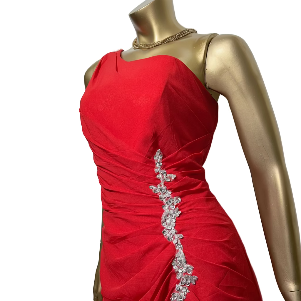 Vestido maxi de gala en tono rojo intenso, confeccionado en una tela fluida con un drapeado lateral elegante que realza la figura y aporta un efecto visual de estilización. Presenta un diseño asimétrico de un solo hombro, ideal para quienes buscan una silueta moderna y sofisticada. ✨