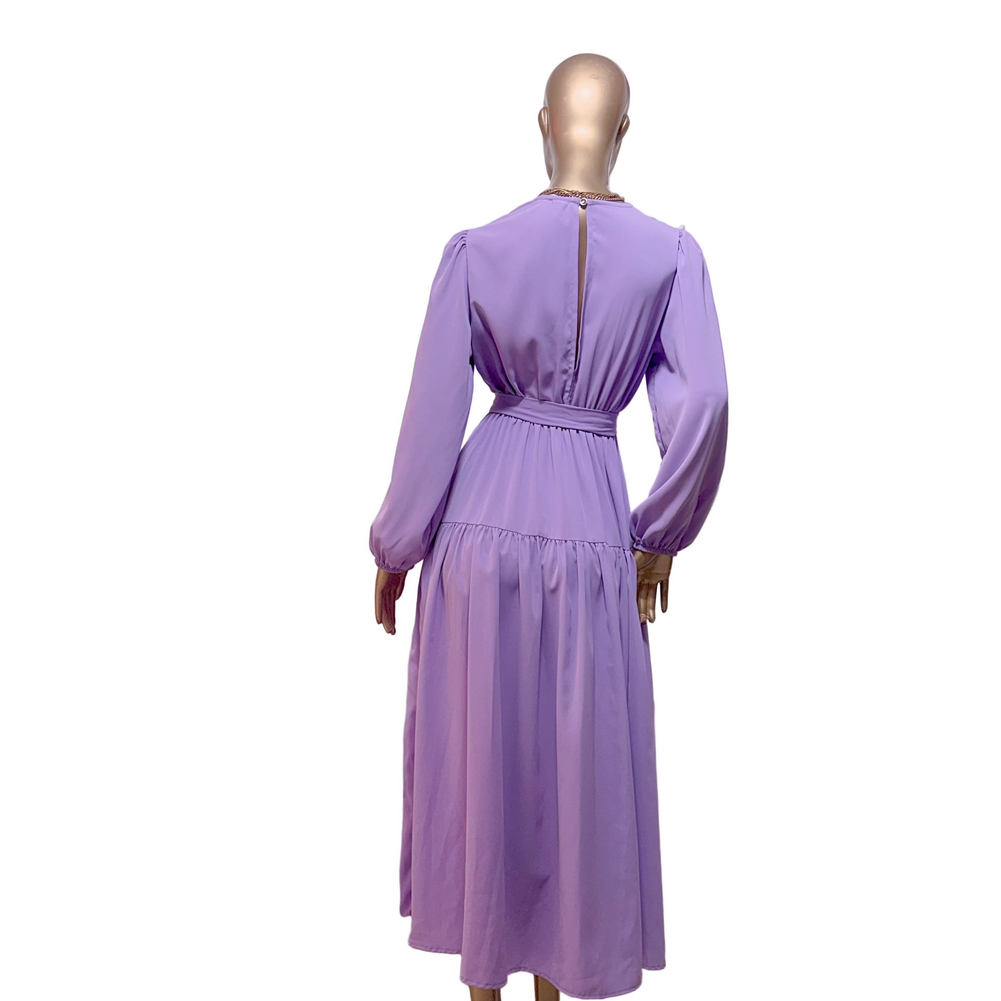 Vestido Verano en un delicado tono lila pastel, confeccionado en tela ligera y fluida que aporta frescura y movimiento. Presenta un escote en V cruzado, que estiliza el torso, acompañado de un cinturón del mismo tejido para ajustar la cintura y realzar la silueta. Sus mangas largas abullonadas con puño elástico dan un aire romántico y sofisticado, mientras que la falda larga con caída amplia genera un look etéreo y elegante. 🌸✨