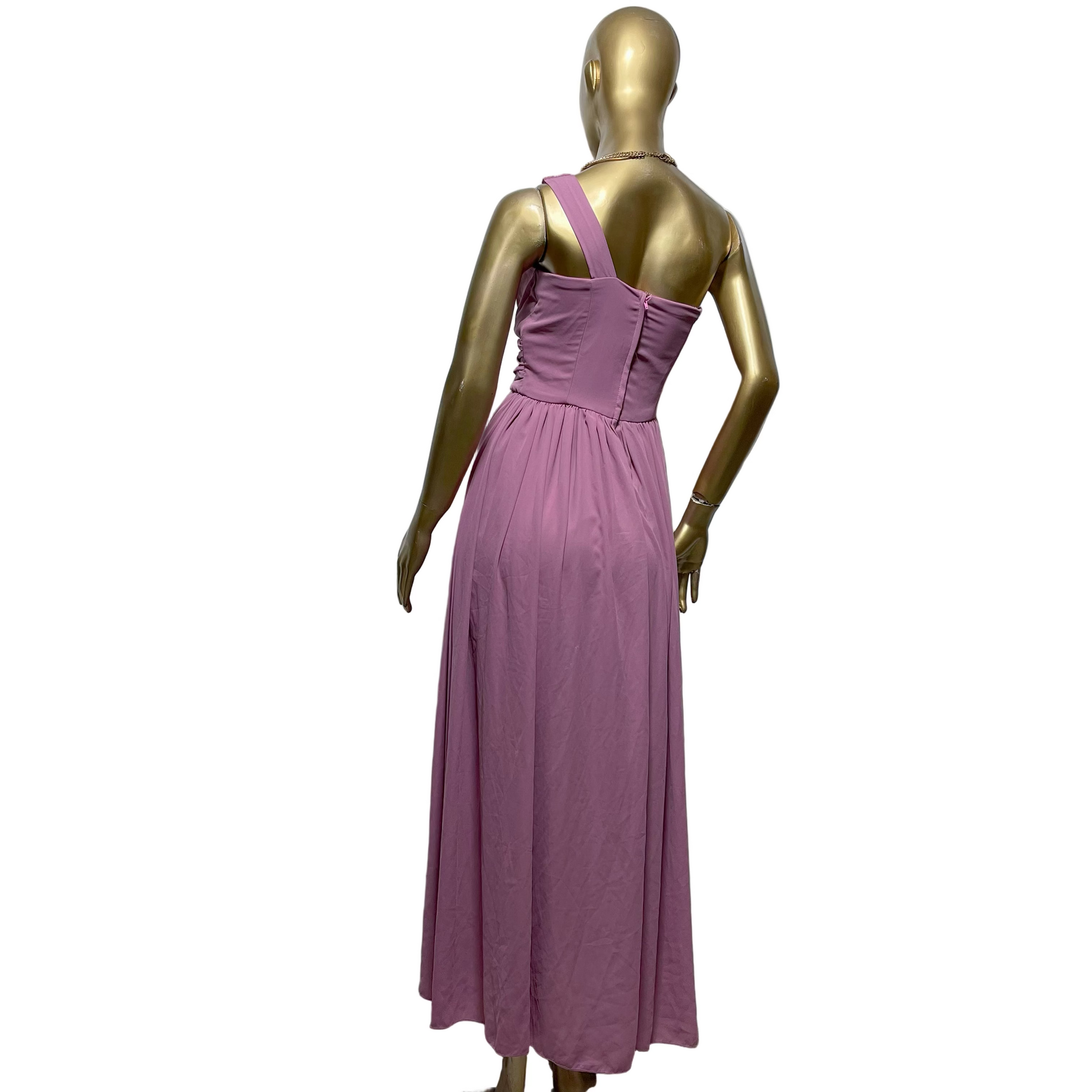 Vestido de fiesta en tono malva suave, confeccionado en tela ligera de caída vaporosa que aporta elegancia y comodidad. ✨