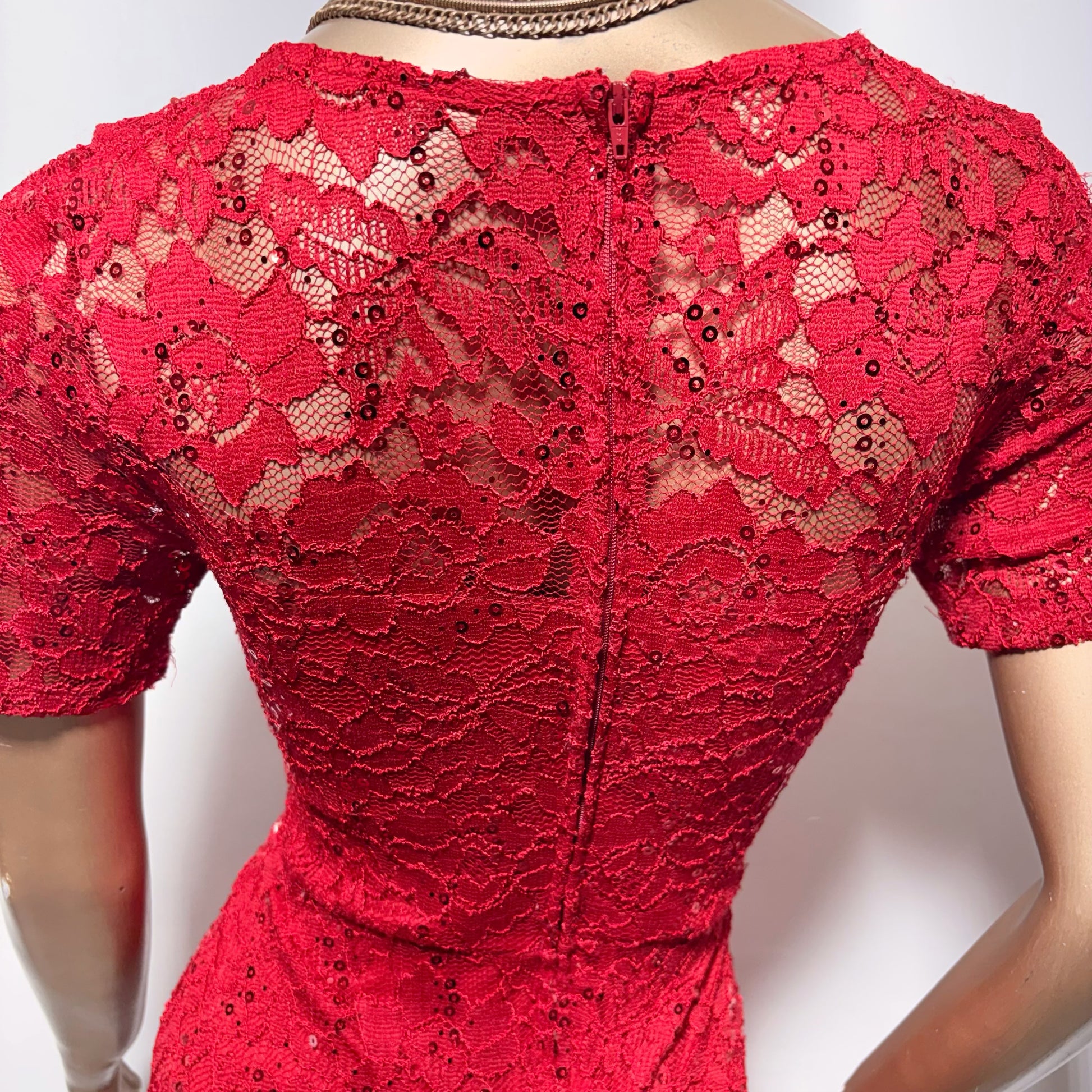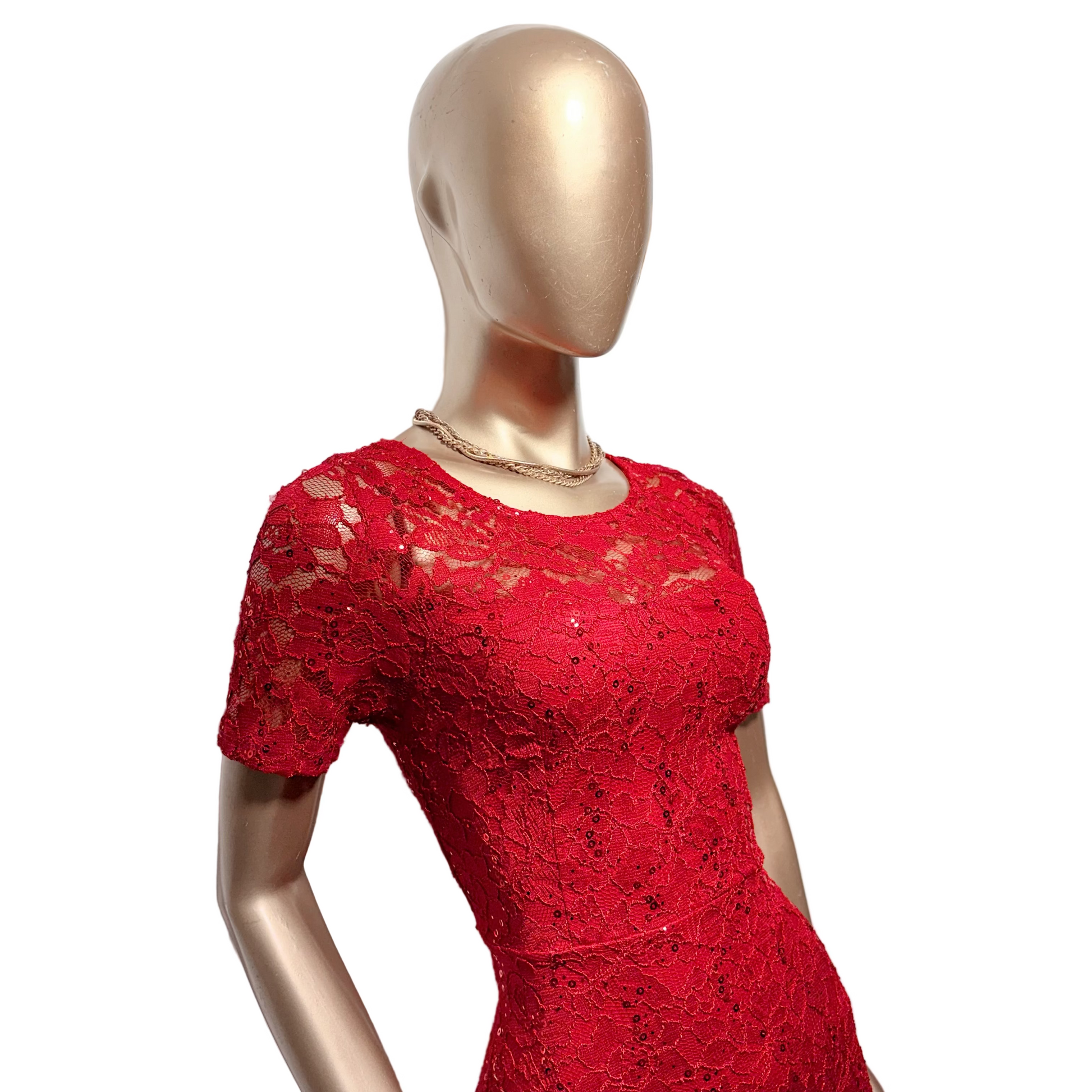Vestido La Scala en un impactante tono rojo, confeccionado íntegramente en encaje floral delicado que combina elegancia y sofisticación. Su diseño cuenta con mangas cortas, escote redondo discreto y un corte entallado en la cintura que estiliza la silueta. La falda larga con ligera transparencia en el bajo aporta un aire refinado y glamuroso, ideal para ocasiones formales. ❤️✨