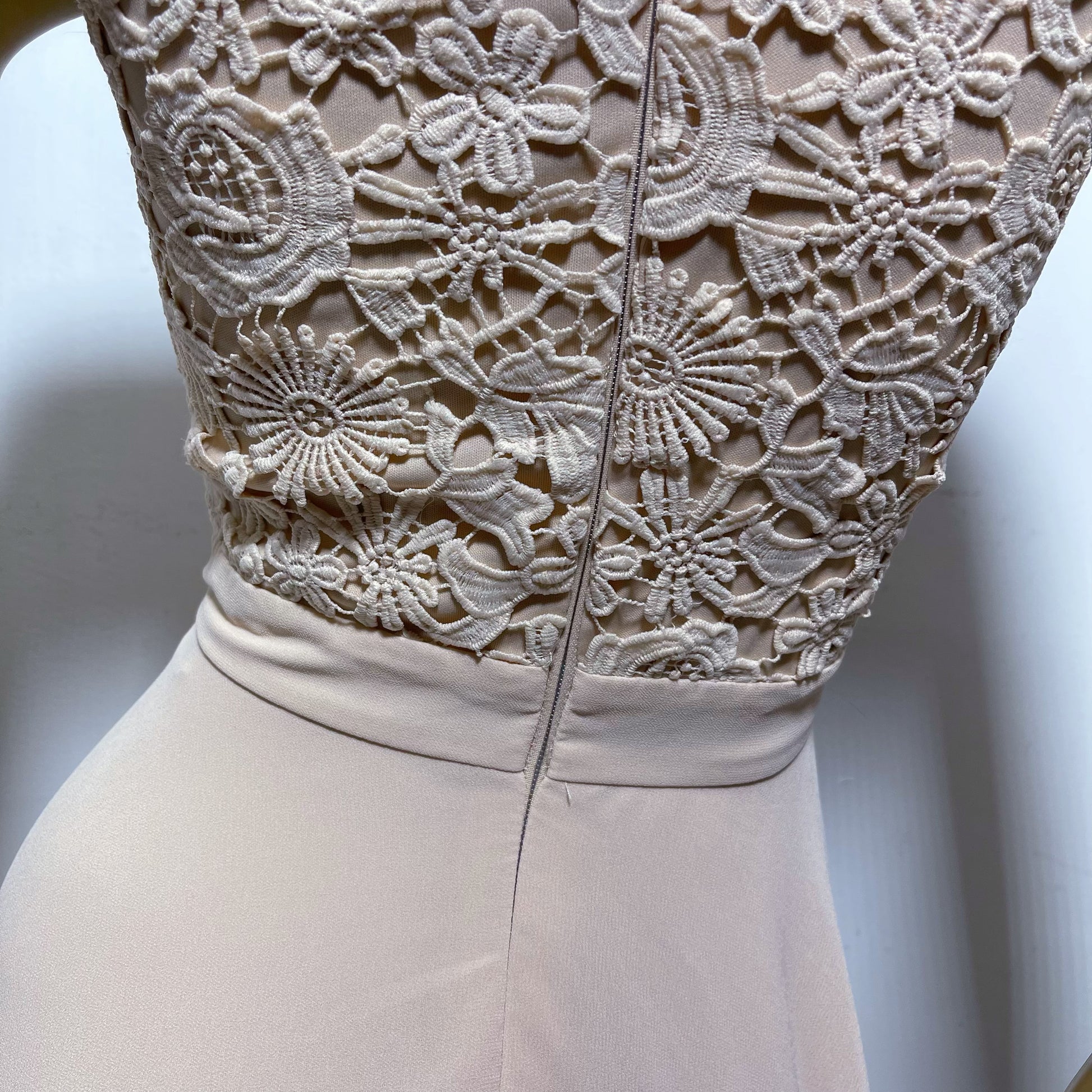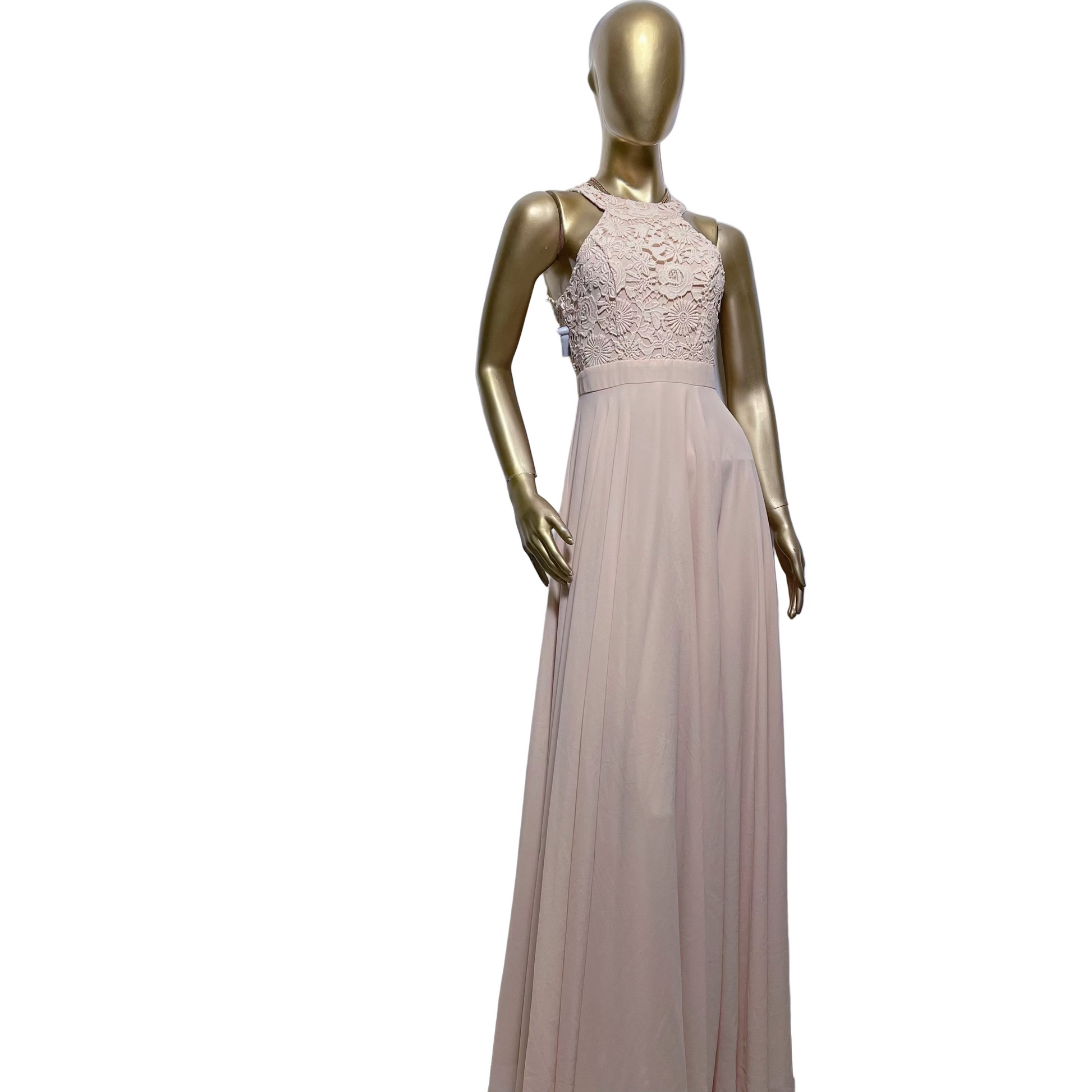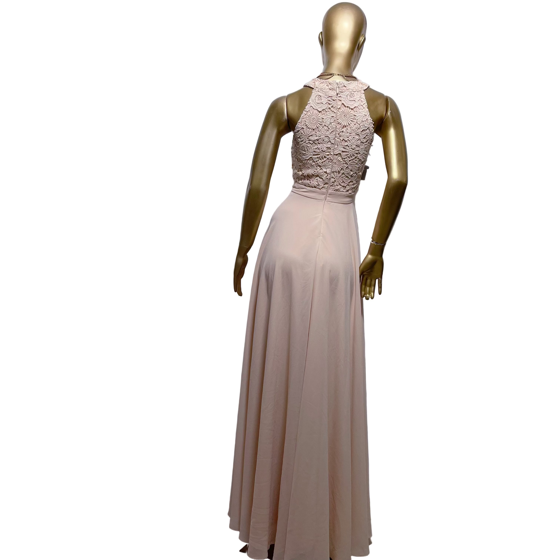 La parte superior presenta un diseño de encaje floral intrincado con cuello halter y espalda descubierta, aportando un toque romántico y refinado. La falda cae en pliegues suaves y verticales, creando una silueta etérea y favorecedora.