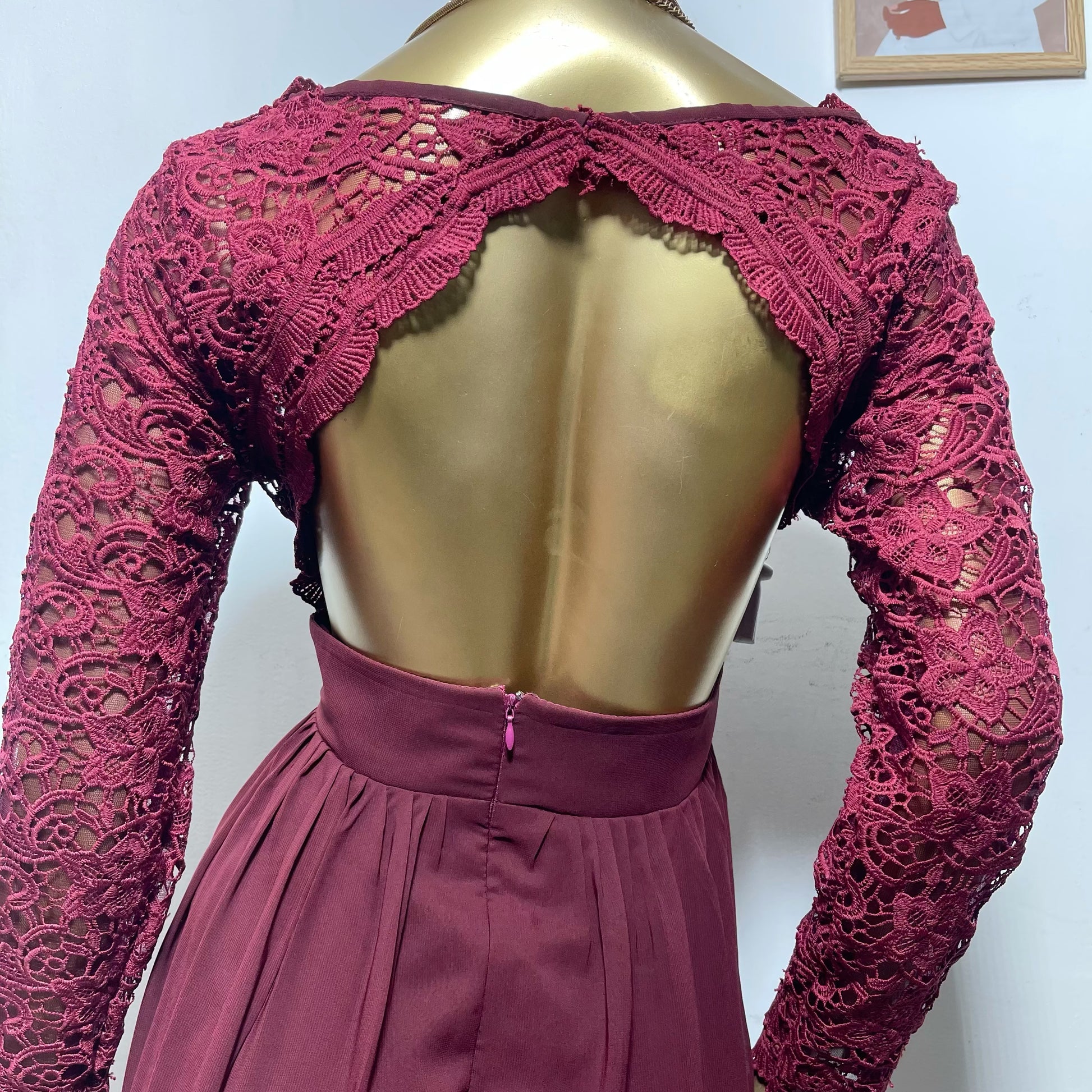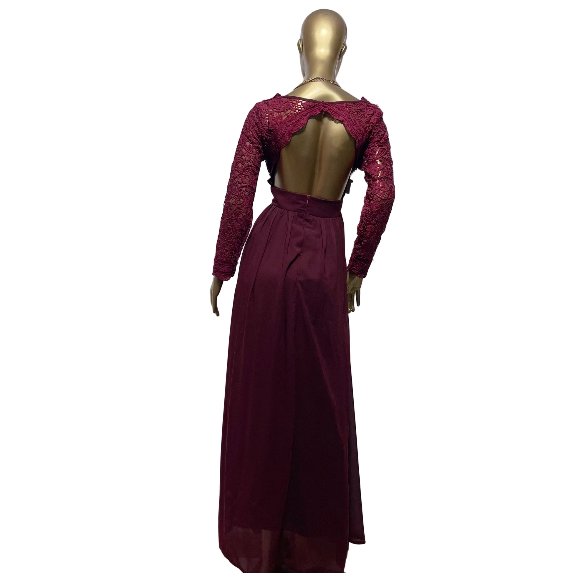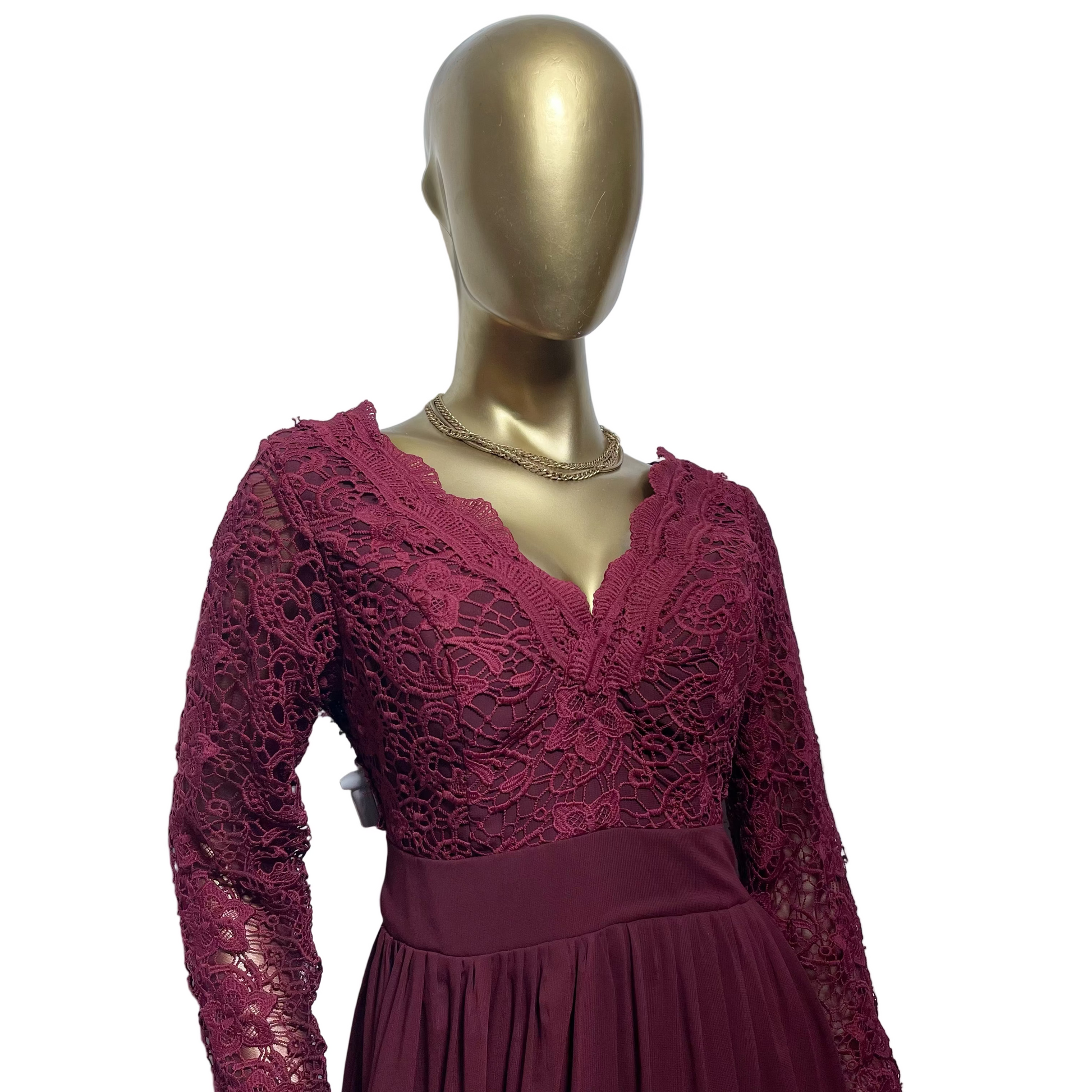 Vestido largo en tono vino intenso, confeccionado en una combinación de encaje y gasa fluida que transmite elegancia y sofisticación. ✨