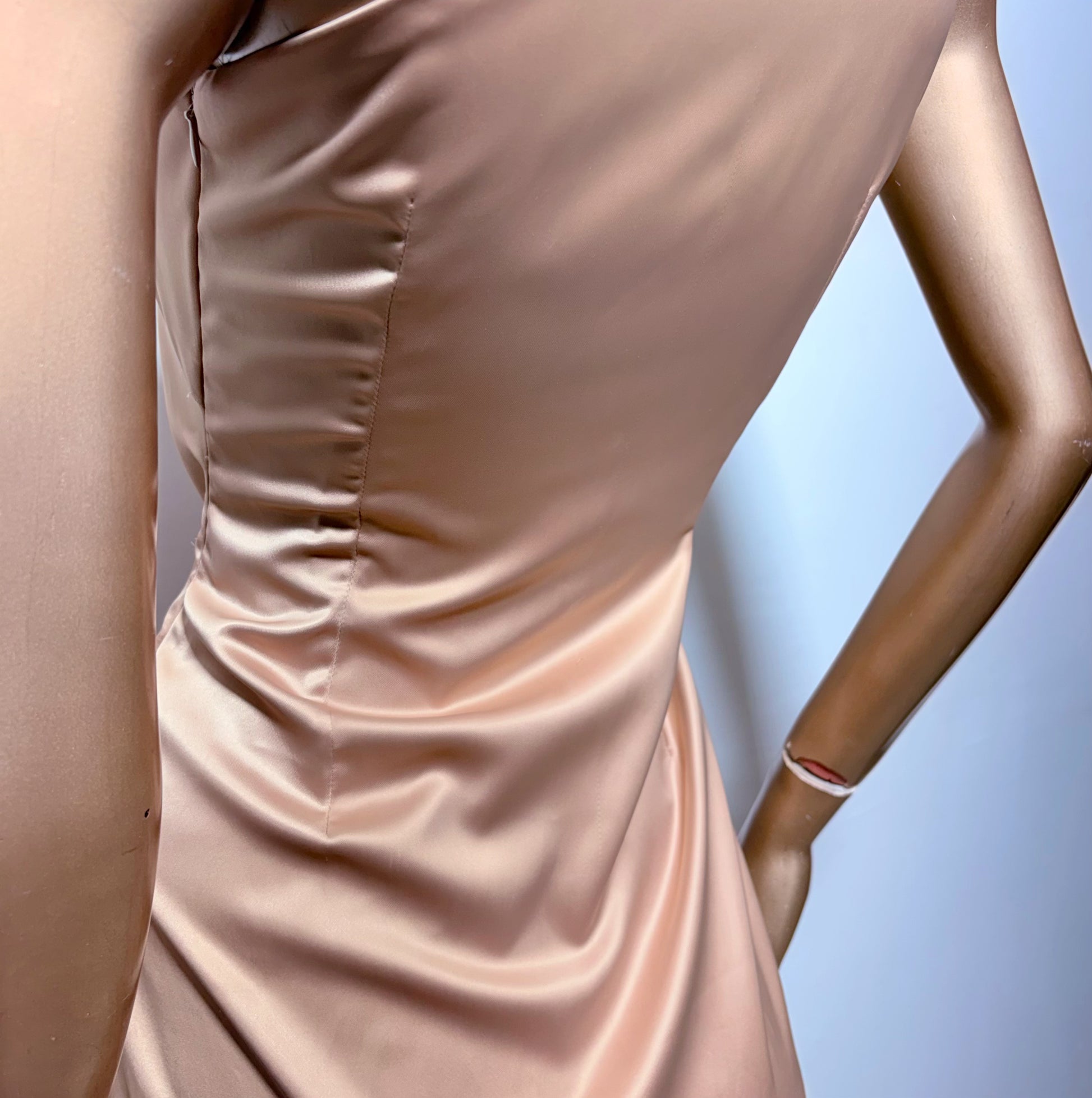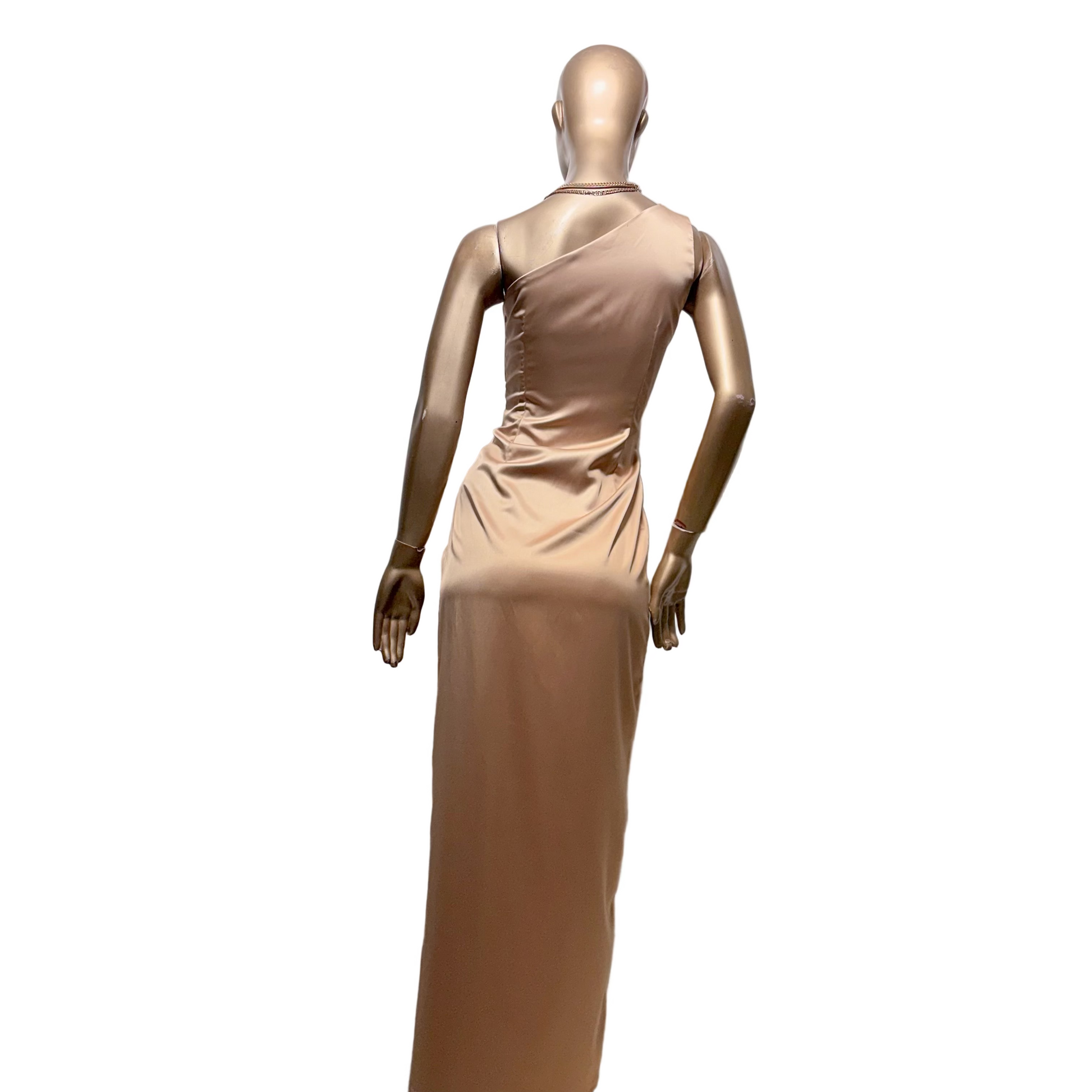 Vestido maxi satinado sin marca, en un elegante tono champagne/beige que refleja sofisticación y delicadeza. Presenta un diseño asimétrico de un solo tirante, con caída fluida que estiliza la silueta. Su detalle más llamativo es la abertura lateral pronunciada, que aporta un aire sensual y moderno, perfecto para ocasiones de gala, cenas formales o eventos especiales. ✨💫