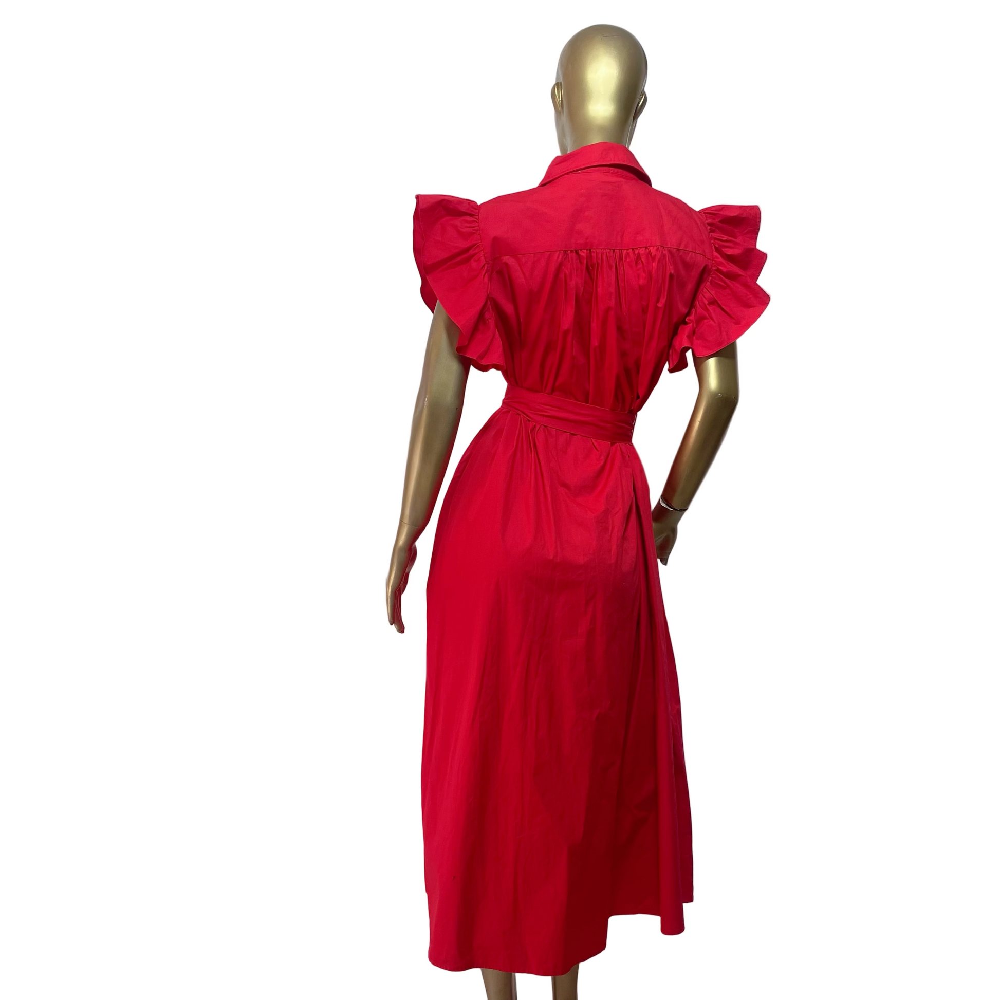 Presenta mangas con volantes amplios, un cuello tipo camisero y botones frontales a lo largo del vestido, que aportan un toque clásico y femenino. Incluye un cinturón del mismo tono con hebilla metálica, perfecto para definir la cintura y realzar la silueta.