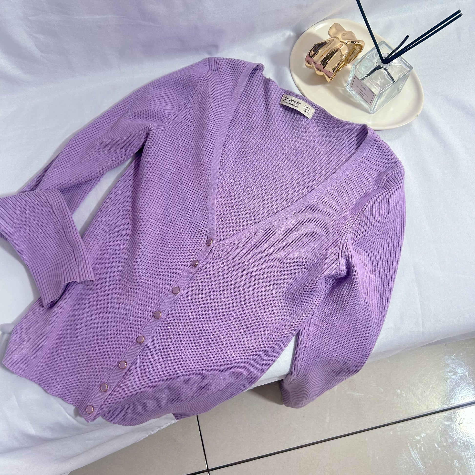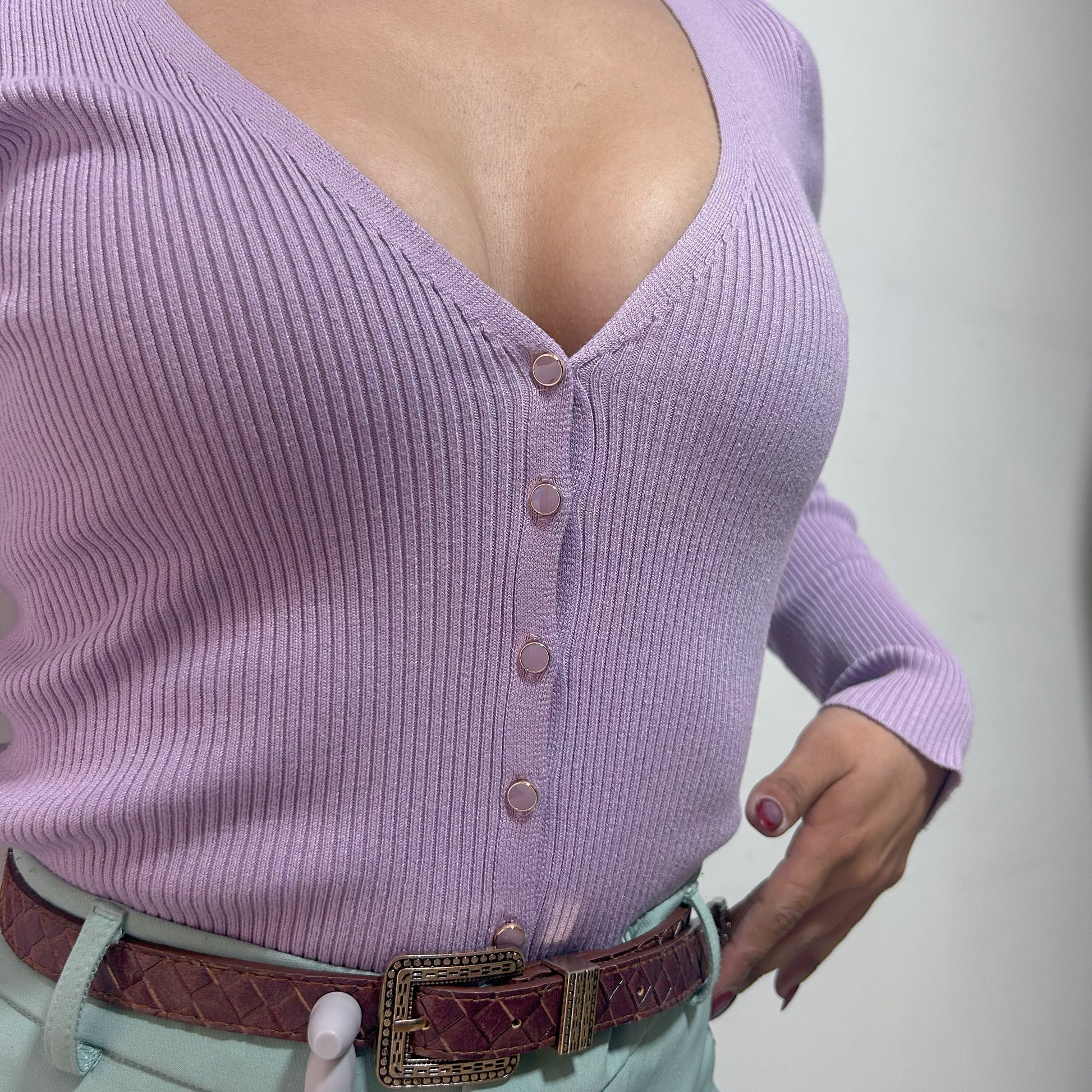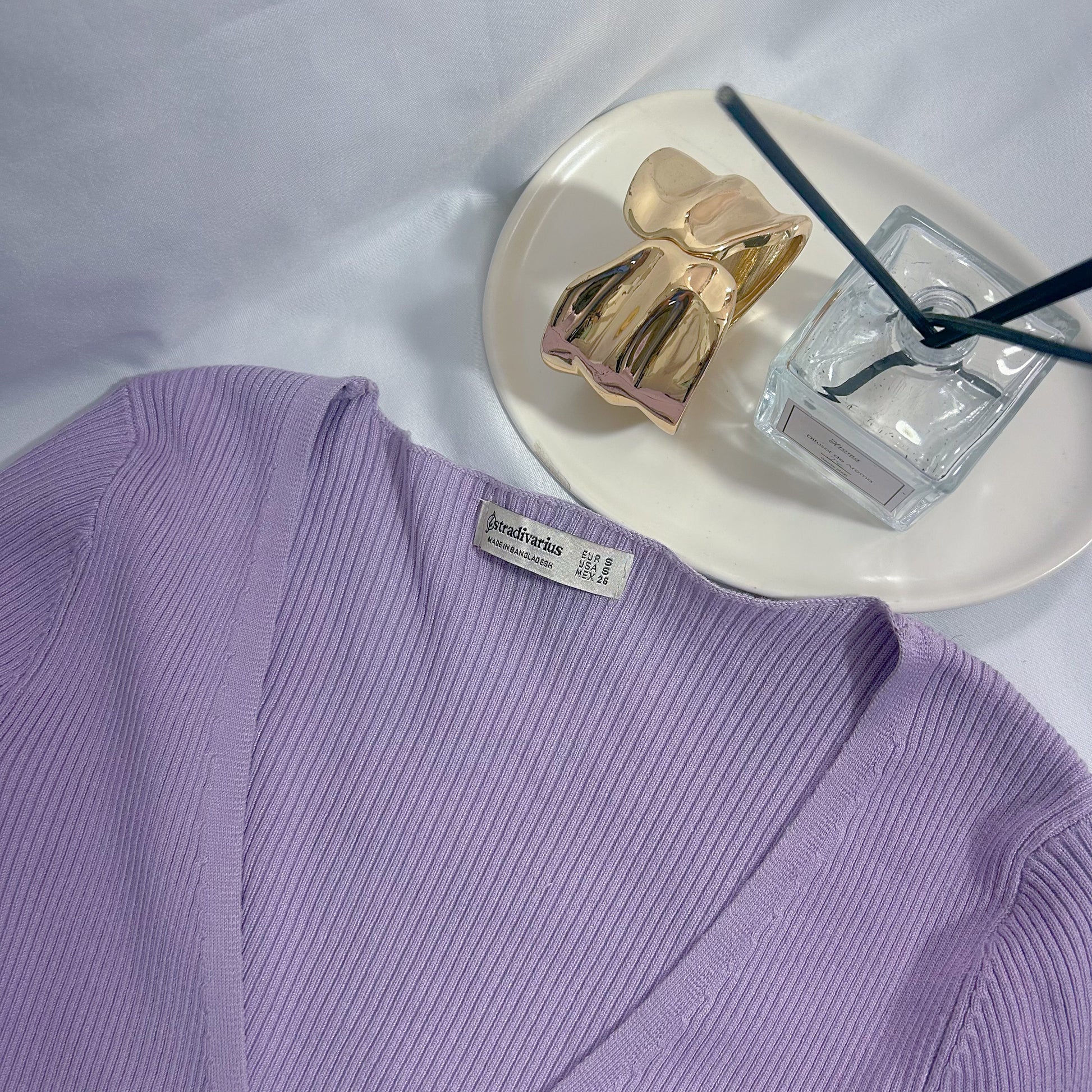 Cardigan Stradivarius en tejido canalé de punto fino color lavanda, un básico femenino y versátil que aporta un toque delicado a cualquier look. Posee escote en V profundo y botones frontales pequeños que permiten llevarlo cerrado o semiabierto según el estilo ✨
