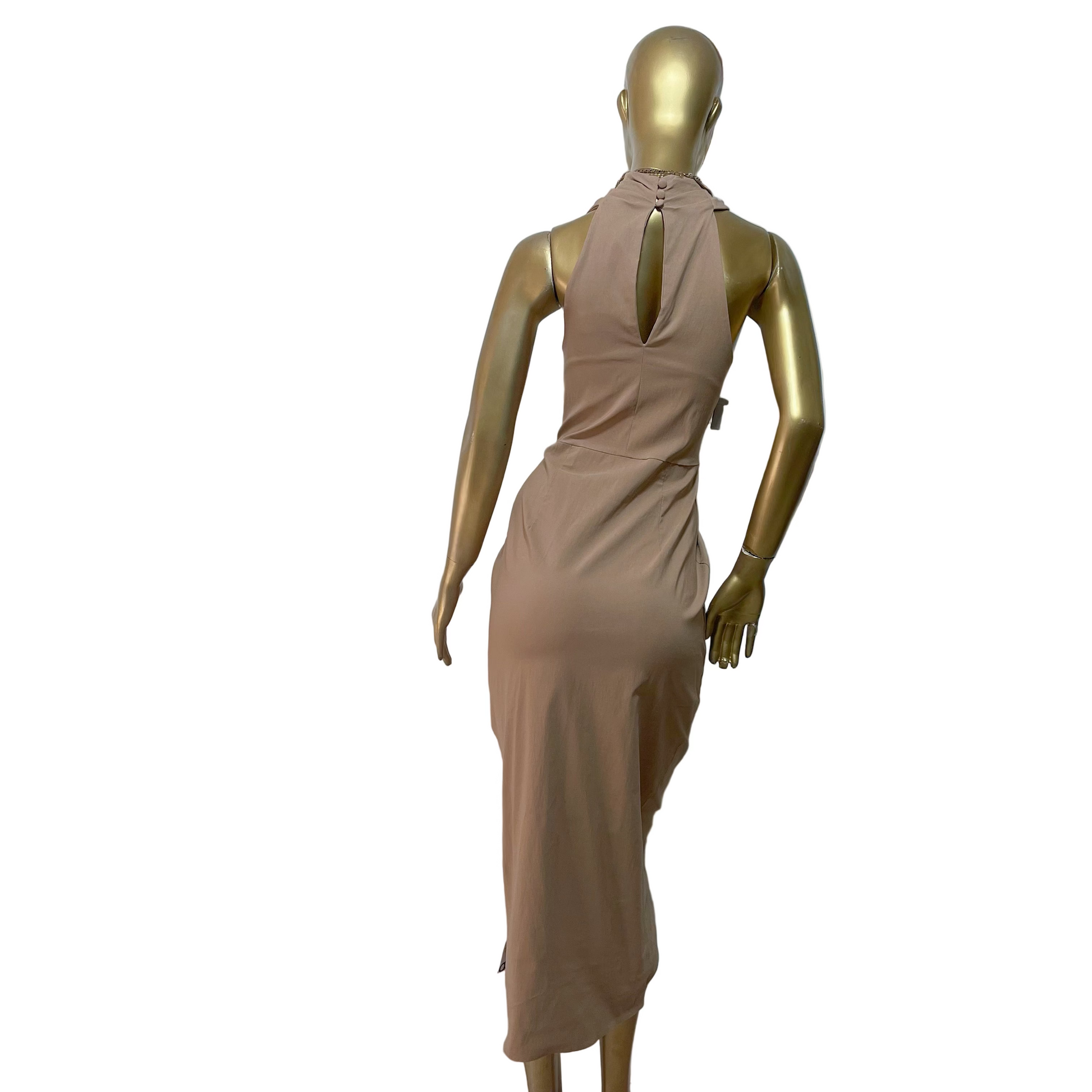 Cuenta con cuello halter cruzado y un detalle de abertura frontal discreta que aporta un toque moderno y sensual. Su corte entallado al cuerpo resalta la figura con sofisticación, ideal para un look limpio y estilizado.