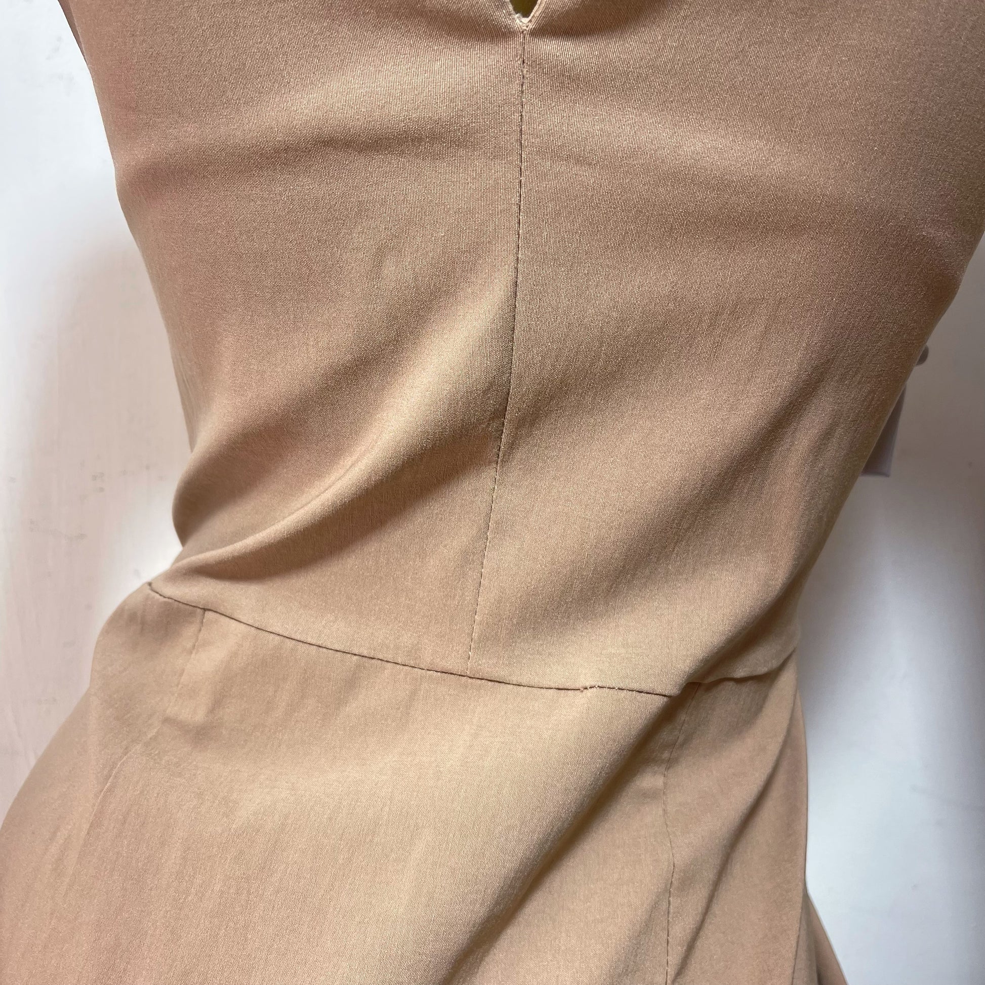 Vestido midi en tono beige neutro, confeccionado en una tela estructurada con ligera elasticidad, que se adapta con elegancia a la silueta. 🤍