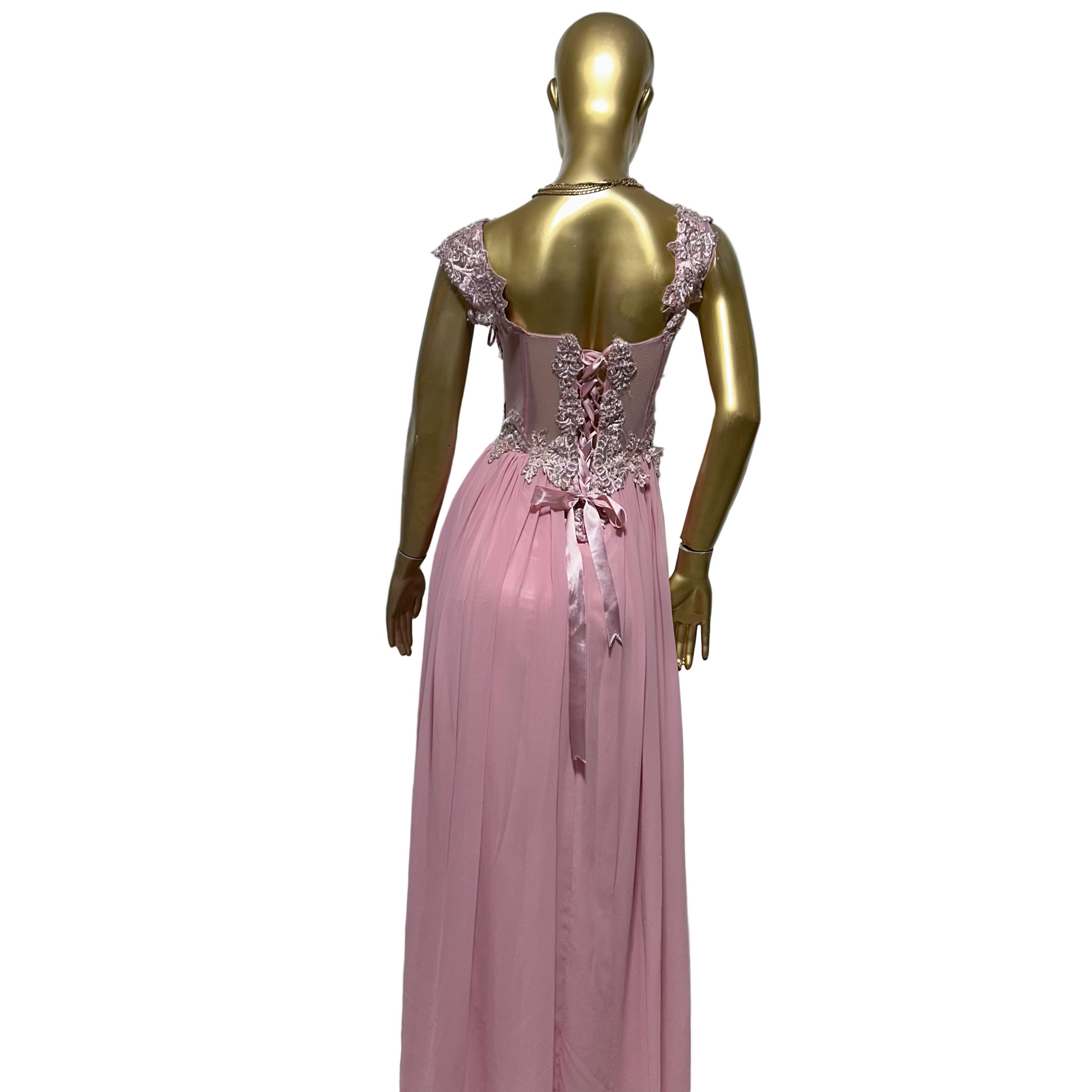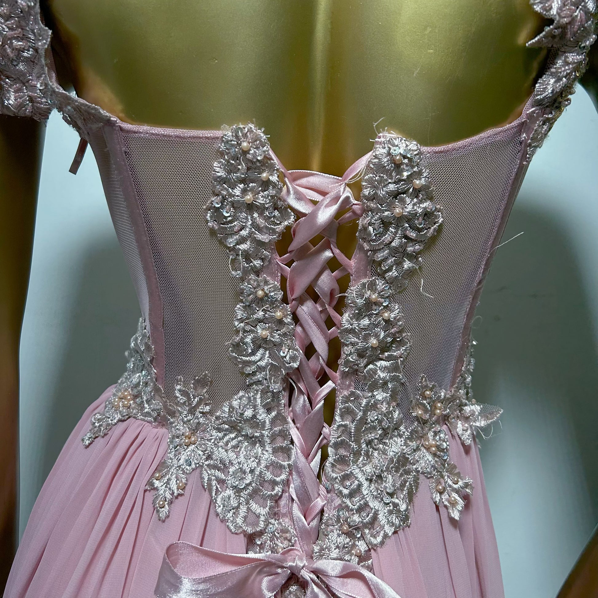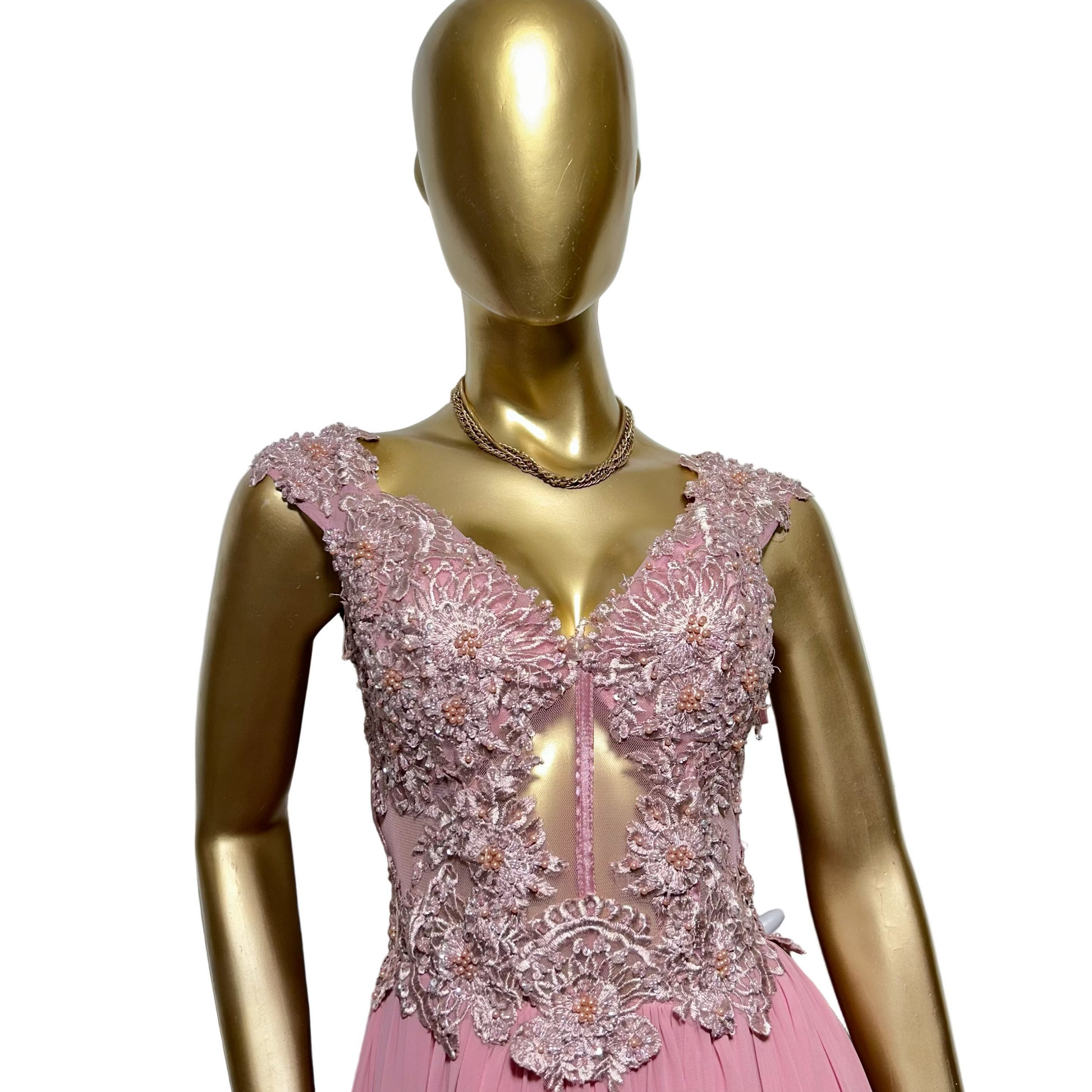 Vestido de gala en un delicado tono rosa pastel, confeccionado en chifón fluido con un cuerpo superior bordado en encaje floral y aplicaciones brillantes que aportan un aire romántico y elegante. ✨