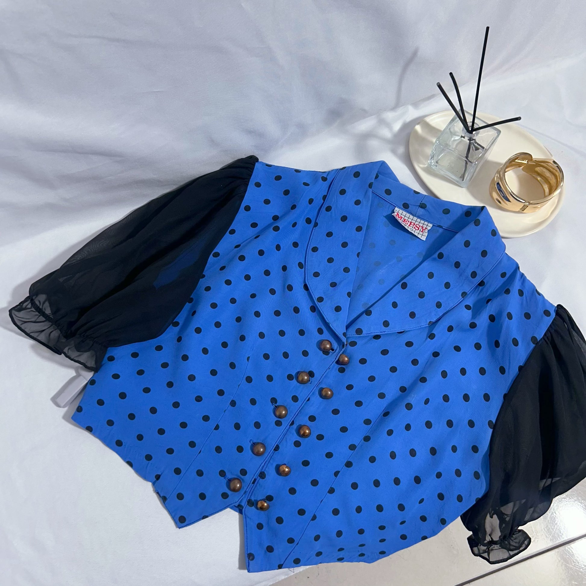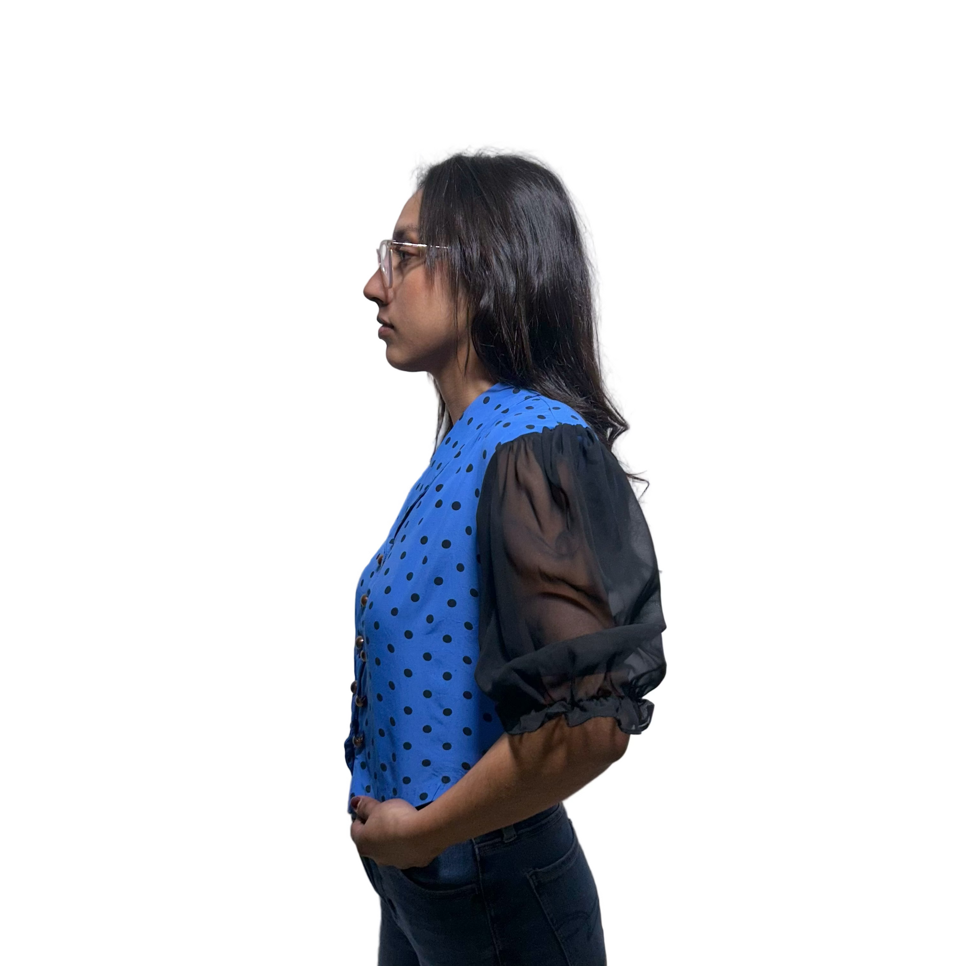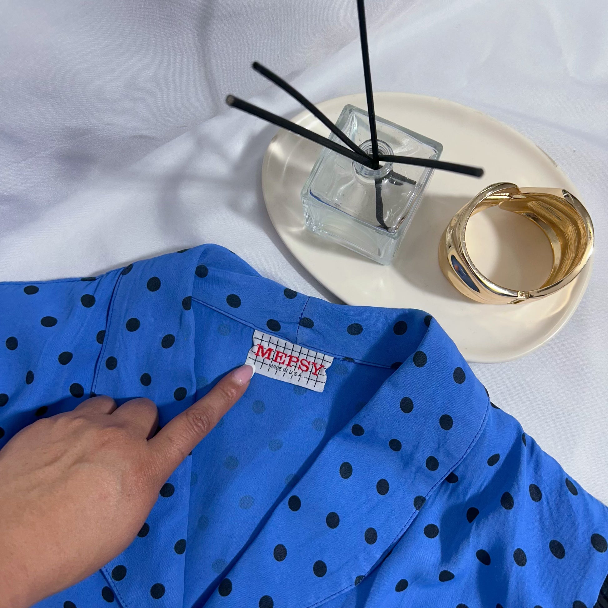 Dale un toque vintage y único a tu look con esta Blusa de la marca MEPSY, confeccionado en un vibrante tono azul eléctrico con lunares negros. 💙⚫