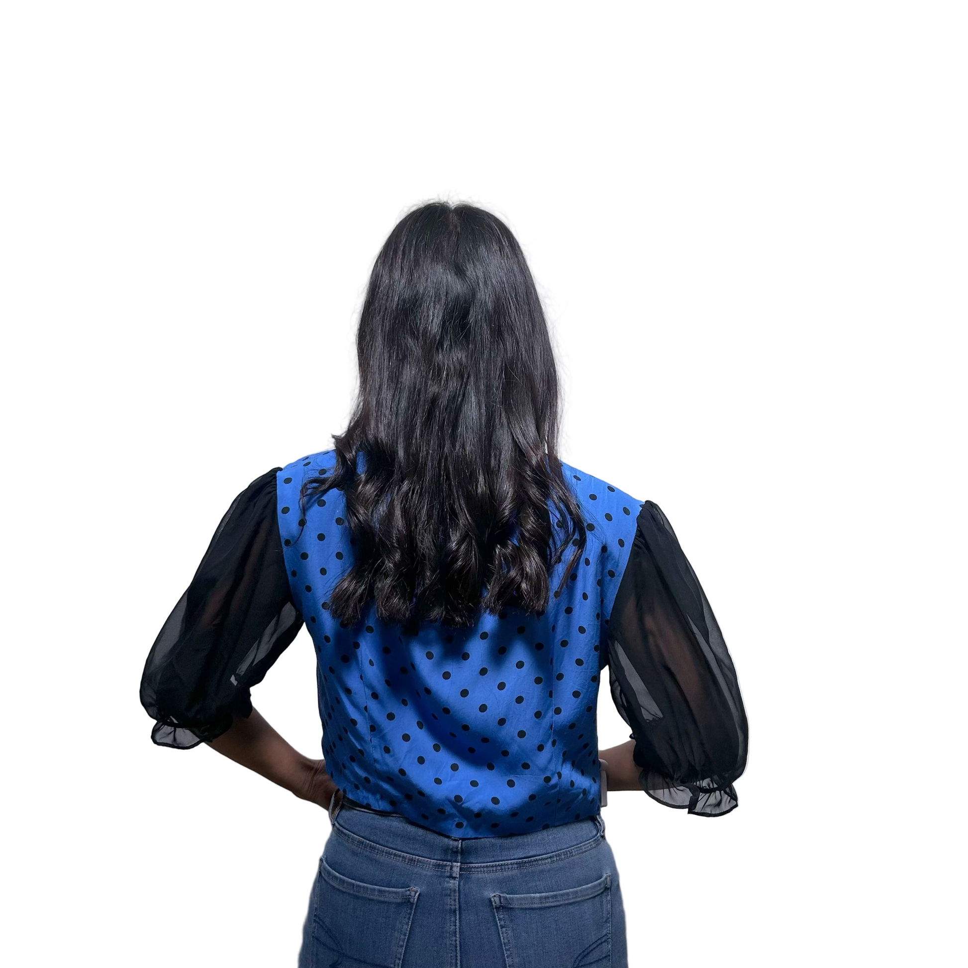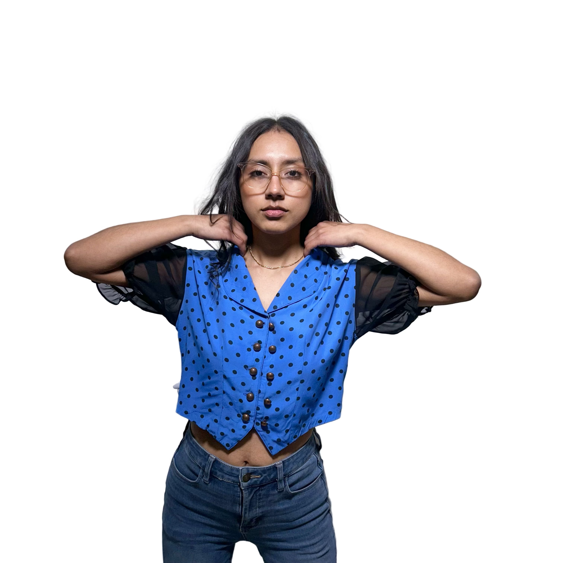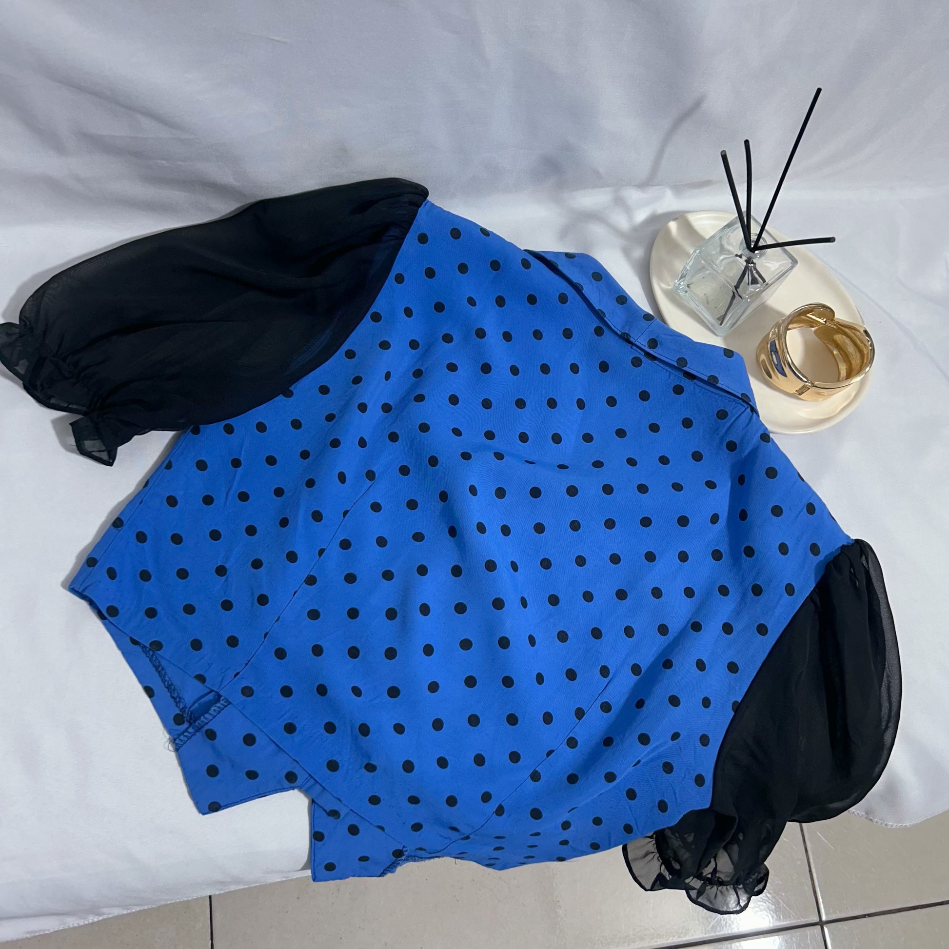 Dale un toque vintage y único a tu look con esta Blusa de la marca MEPSY, confeccionado en un vibrante tono azul eléctrico con lunares negros. 💙⚫