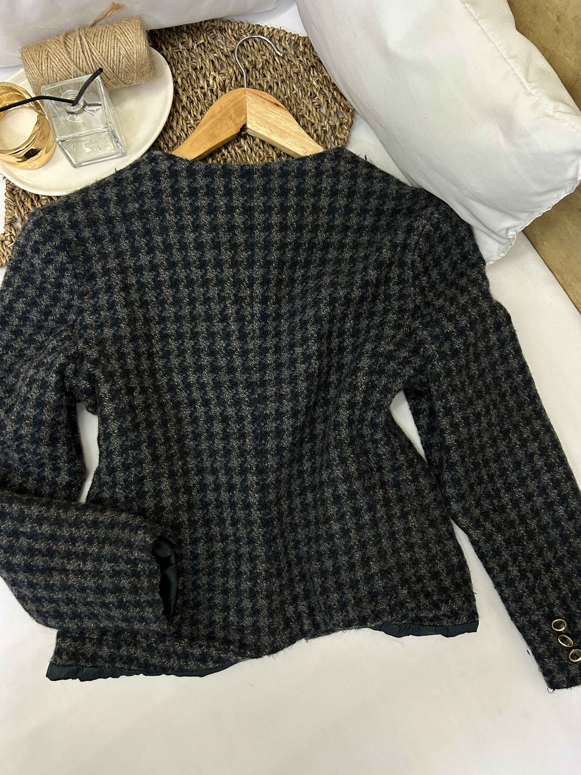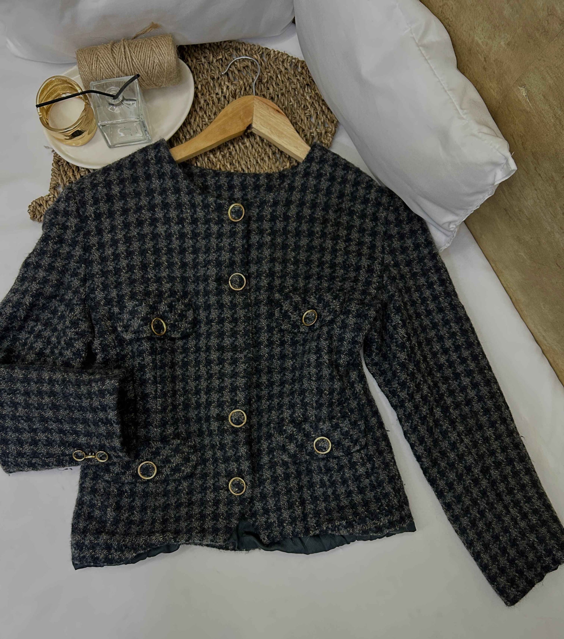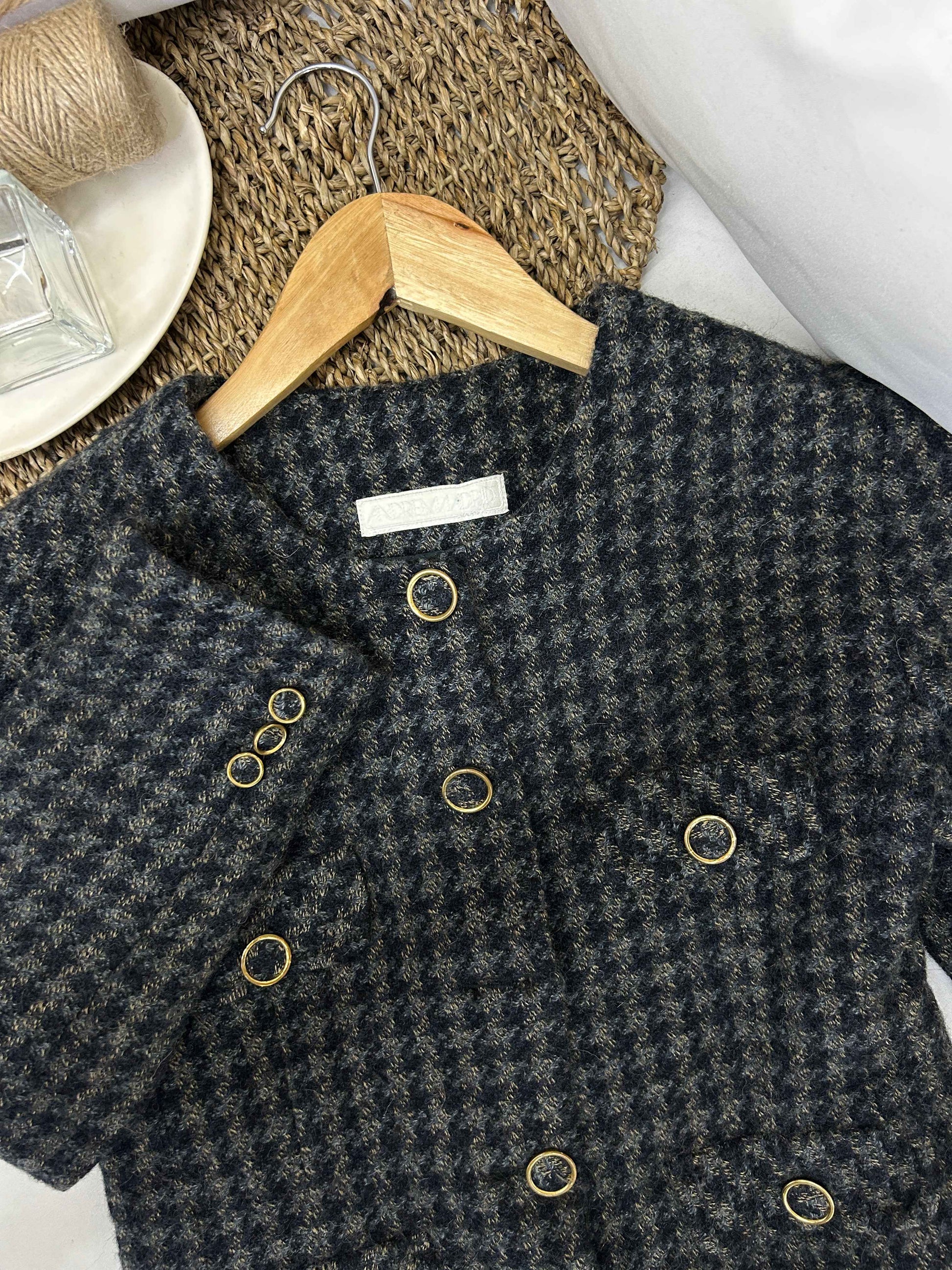 El diseño destaca por sus botones dorados decorativos que aportan contraste y elegancia. Presenta corte estructurado, bolsillos frontales con detalle y un tejido con textura característica tipo tweed que le da profundidad visual y estilo.