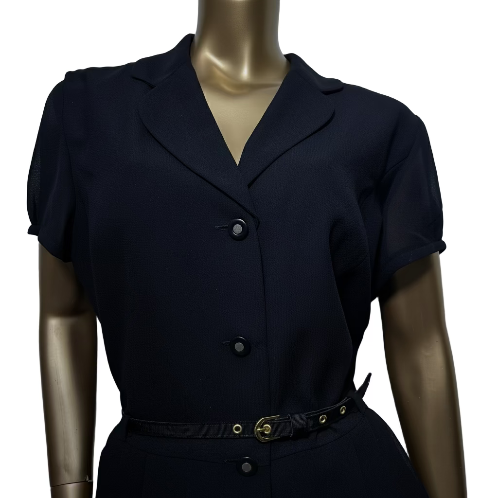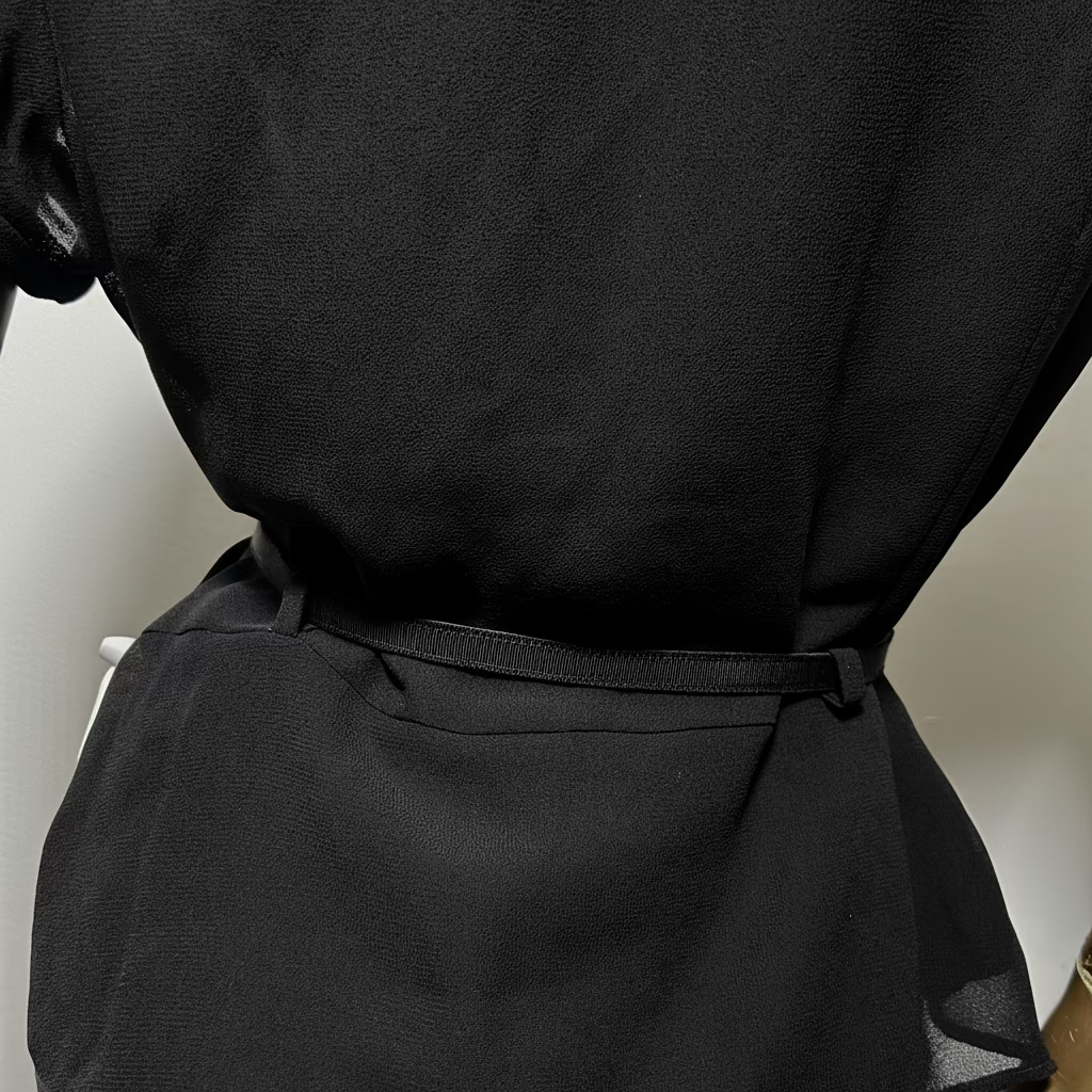 👚 Blusa tipo sastre con cuello solapa, botones frontales y corte peplum que define la cintura. Incluye cinturón delgado decorativo con detalle metálico que aporta un toque de elegancia y modernidad.