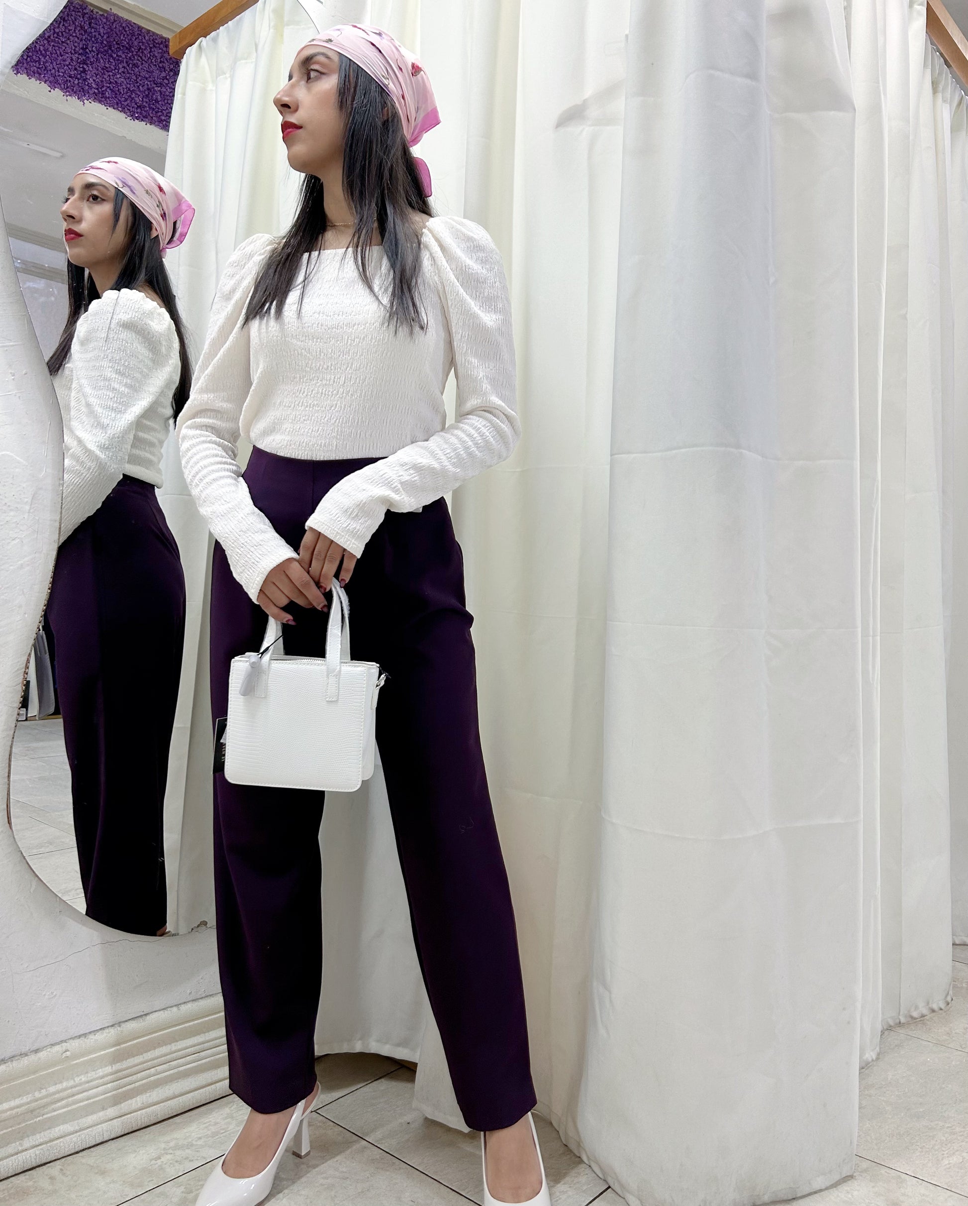 Pantalón recto en tono morado profundo, elegante y sofisticado. Corte de tiro medio-alto que define la cintura y alarga visualmente la figura. Tela firme con buena estructura, perfecta para oficina, eventos o looks estilizados de día y noche. Estado excelente.