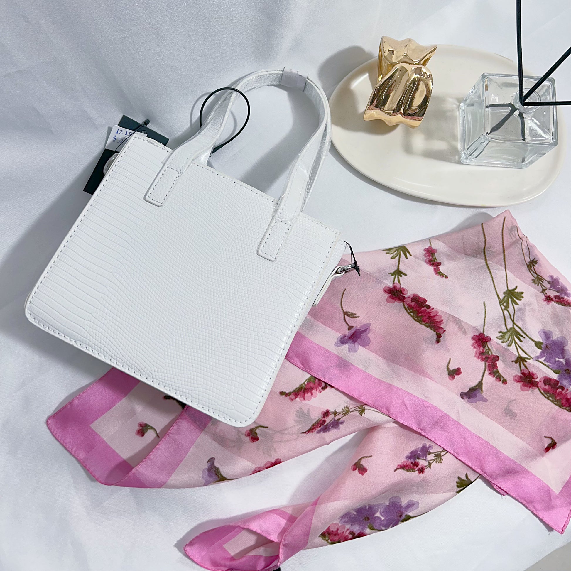 Cartera rígida en tono blanco, con textura tipo cocodrilo y asas cortas. Diseño moderno y minimalista que ilumina el outfit y combina perfectamente con tonos morados y neutros. Ideal para looks elegantes o de tendencia.
