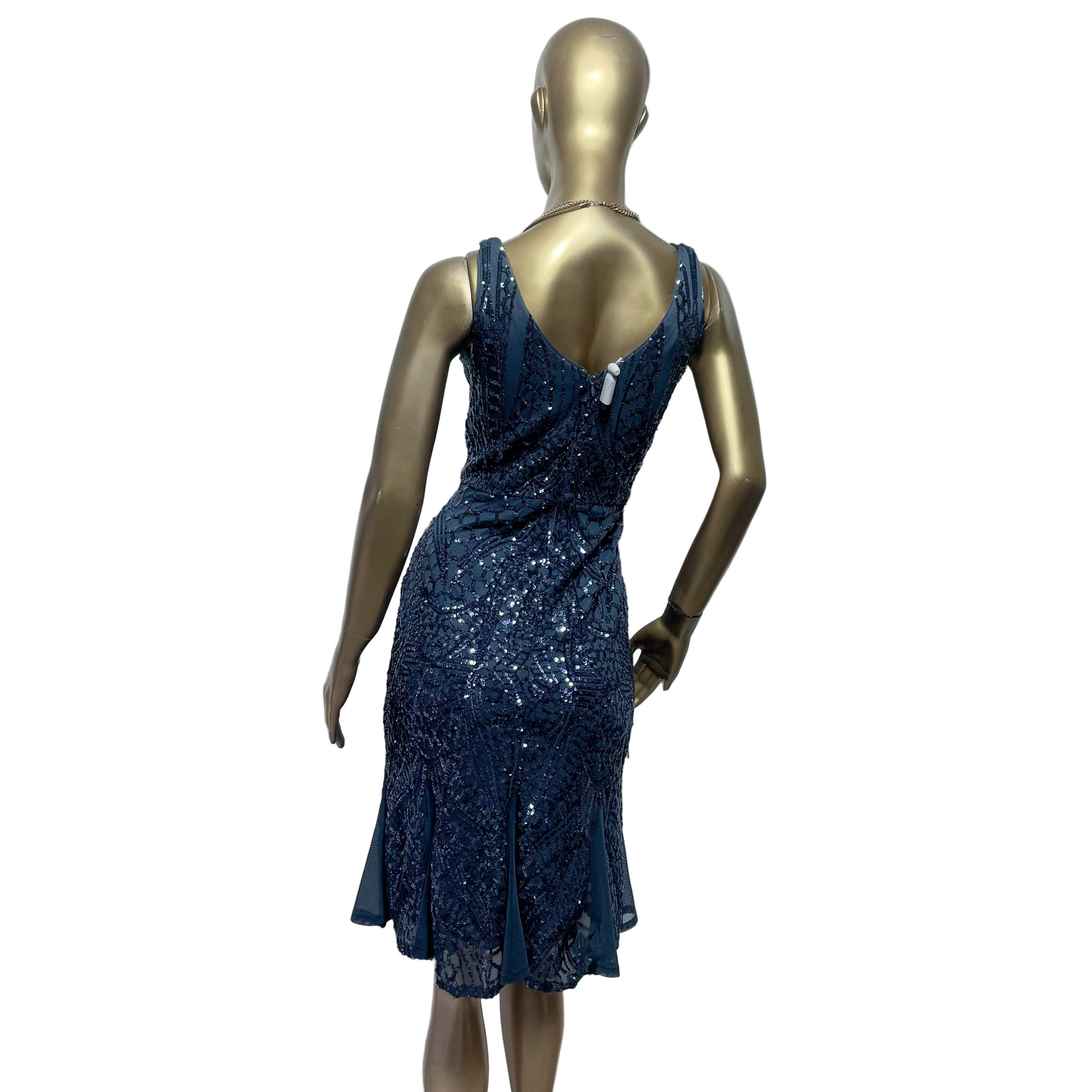 Vestido de fiesta midi en tono azul medianoche, confeccionado en una tela delicada con bordado de lentejuelas brillantes que reflejan la luz con elegancia. ✨