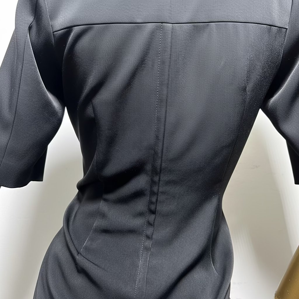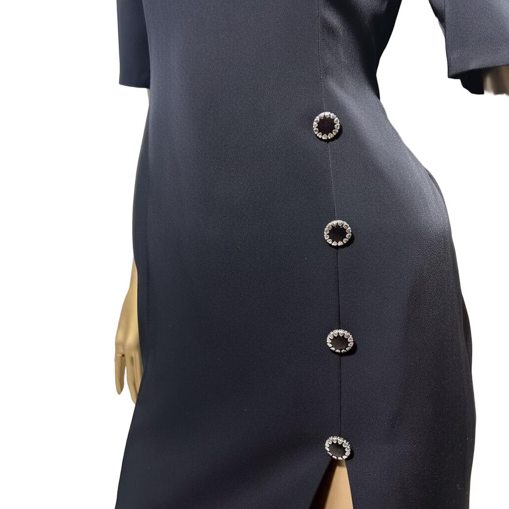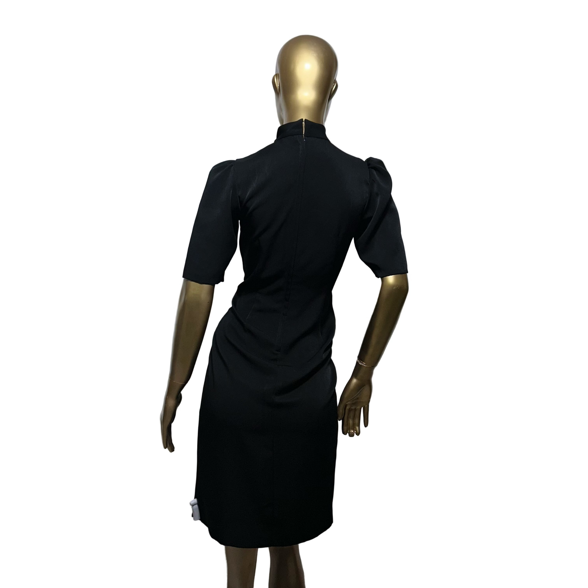 Las mangas abullonadas añaden volumen y equilibrio al diseño, mientras que la falda con abertura lateral y botones metálicos decorativos en línea diagonal estilizan la figura y realzan la silueta femenina.