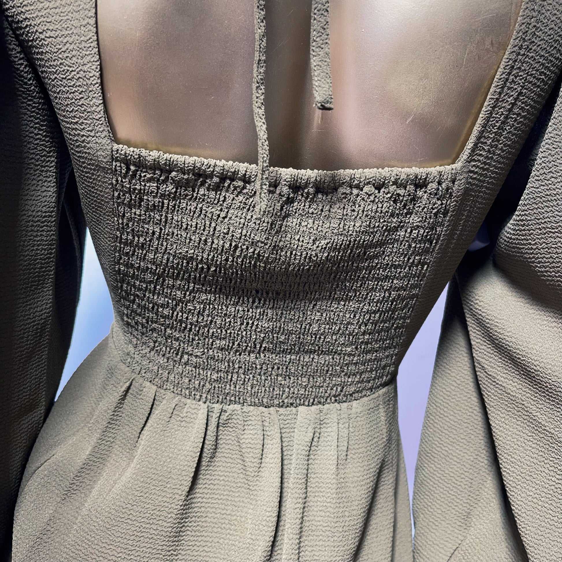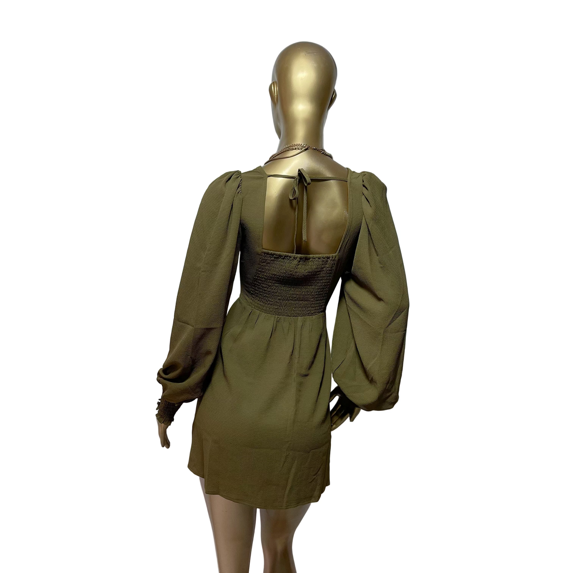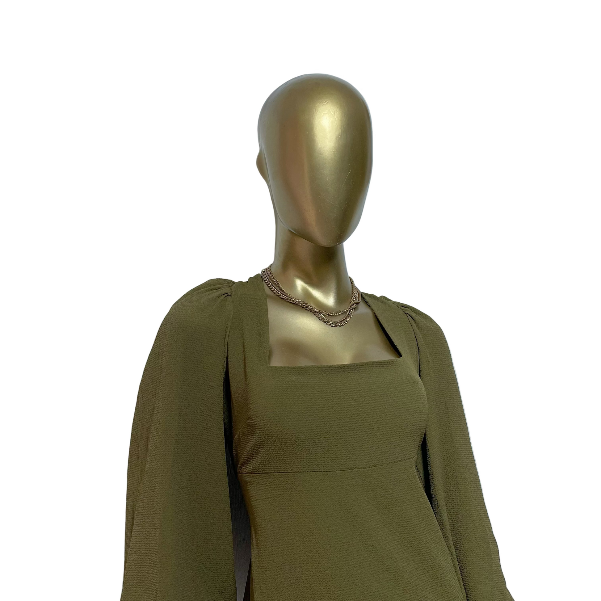 Cuenta con un escote cuadrado estructurado y mangas abullonadas largas con puños ajustados, que aportan volumen y un toque romántico al diseño. Su tono verde oliva lo convierte en una pieza versátil, perfecta tanto para eventos de día como de noche. ✨